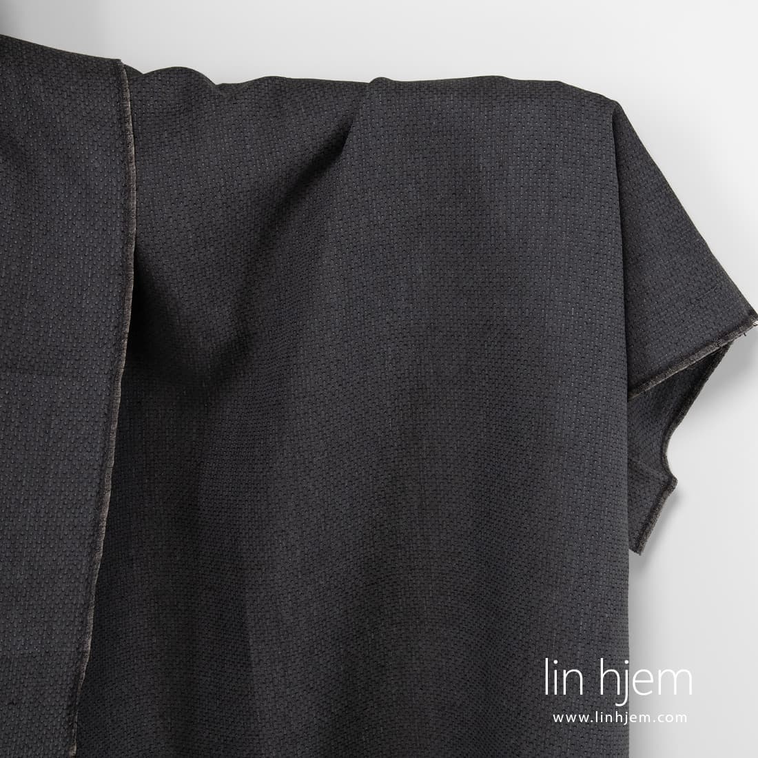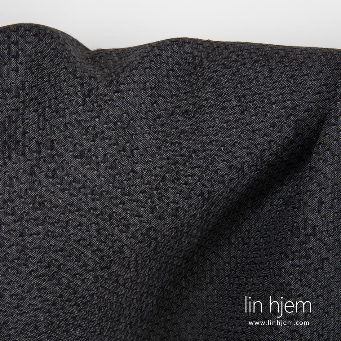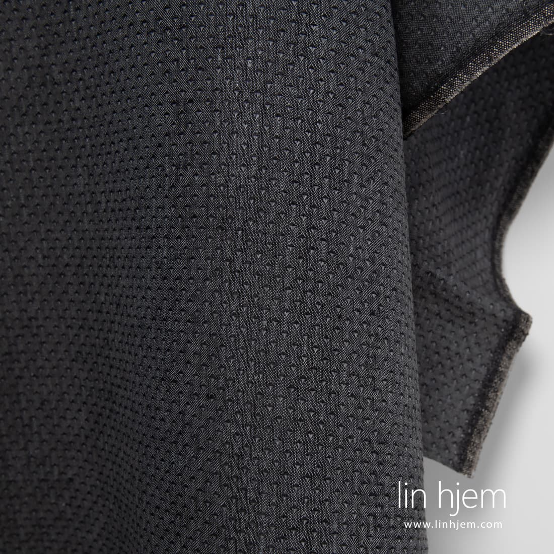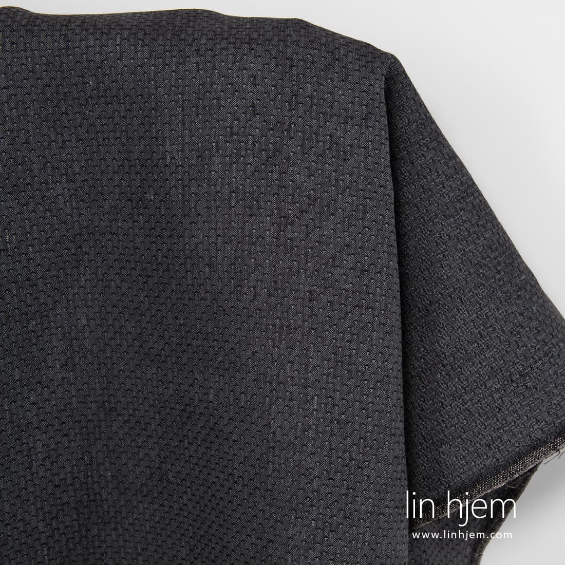 Svart mønstret linstoff. Nydelig mønster ble vevd av svarte og grå garn. Holdbart, tettvevd, middels tykkelse.
