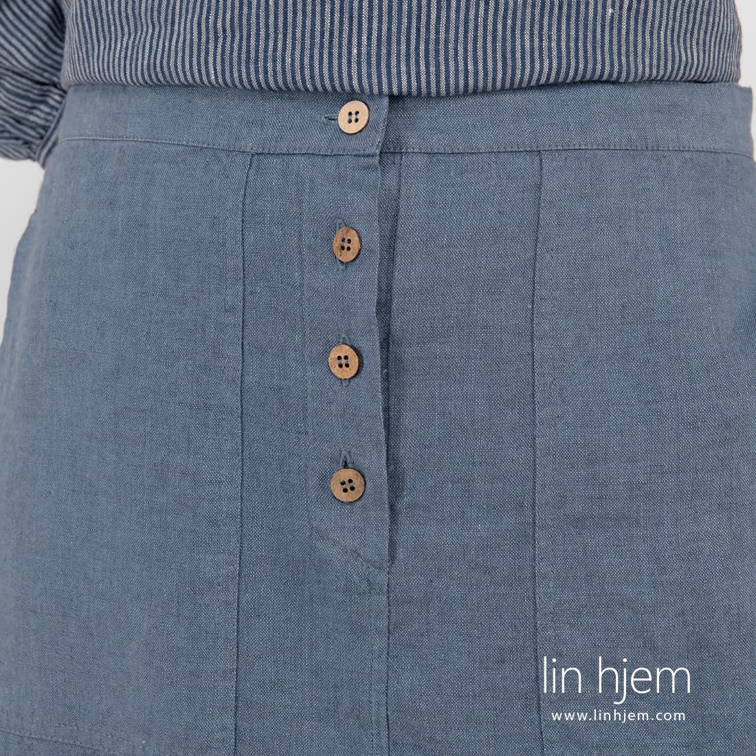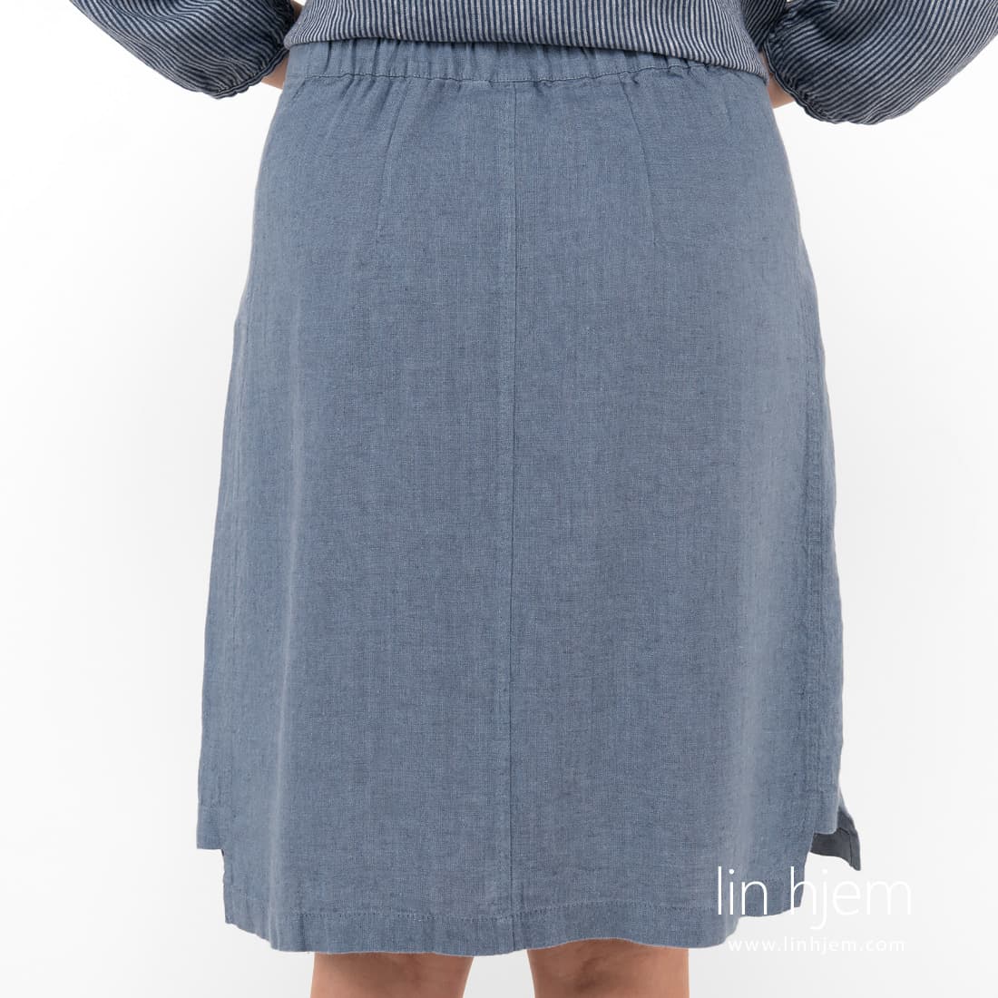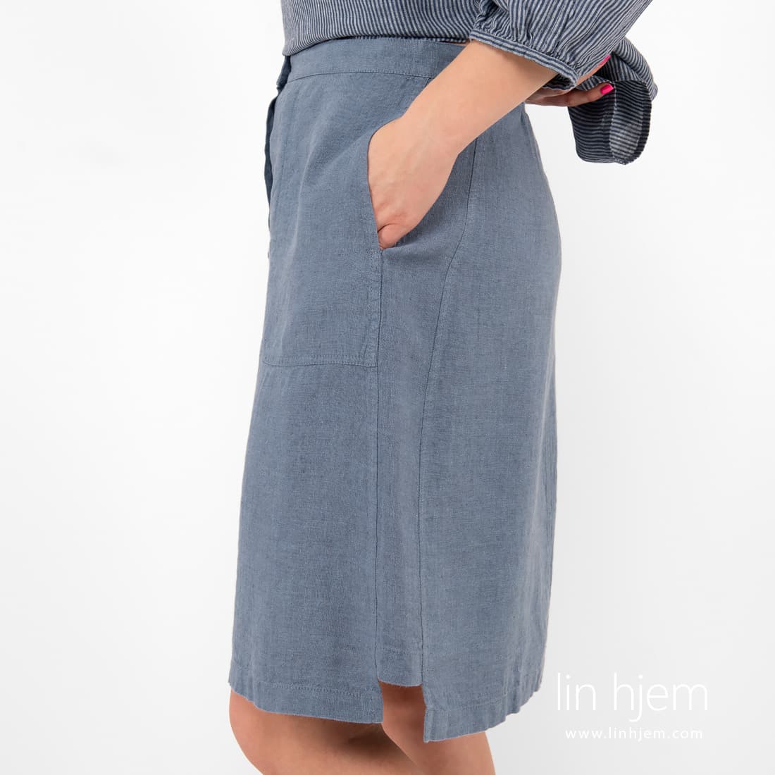 - Detaljer: lommer, knappelukking foran, splitt i sidene, bred strikk bak i midjen