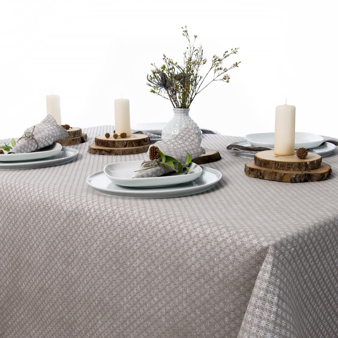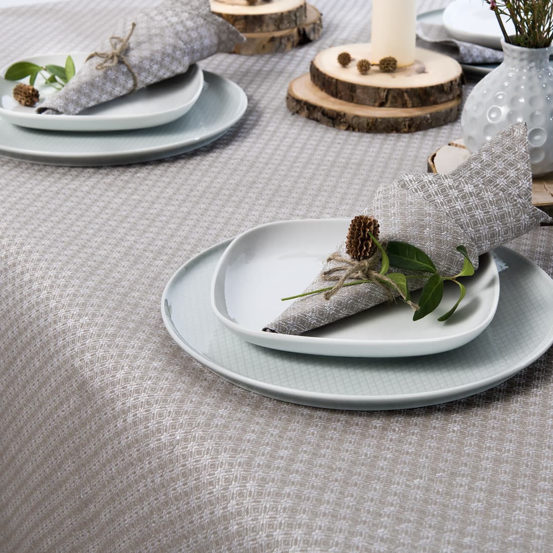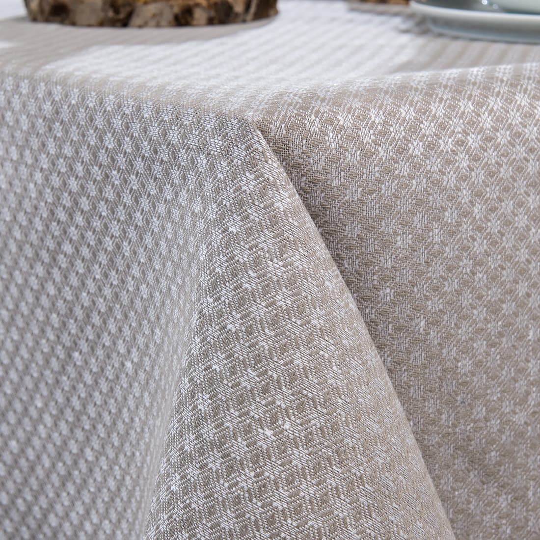Mønstret lin/bomull duk vevd i hvite og grå romber. Denne duken vil dekorere spisebord og passe perfekt inn i ethvert interiør. Kombiner denne duken med servietter i samme farge og stoff.