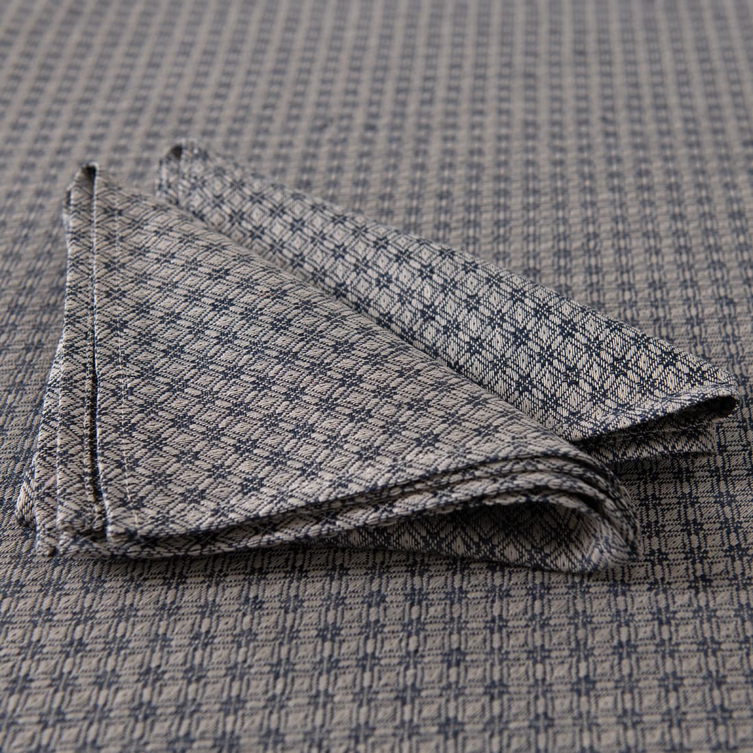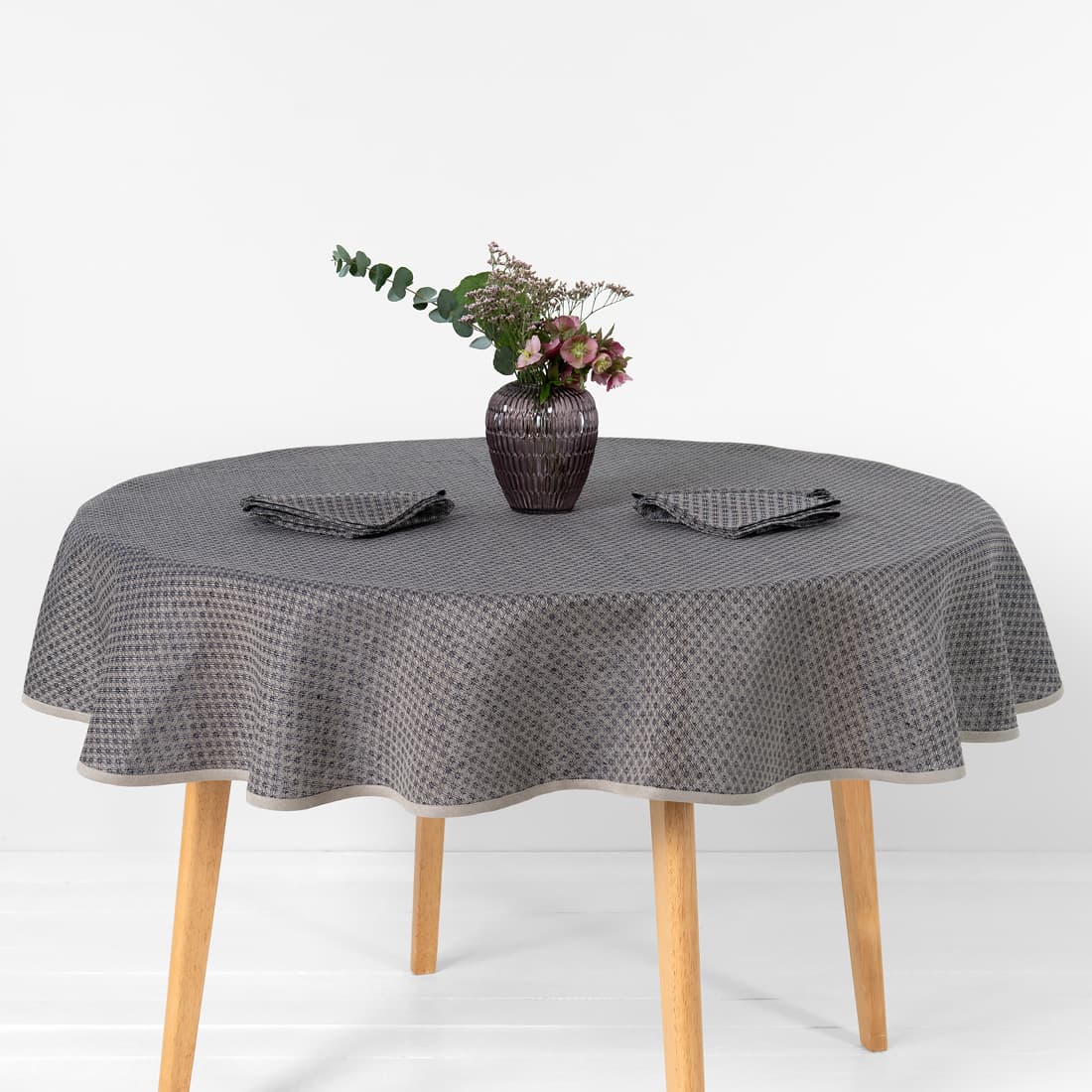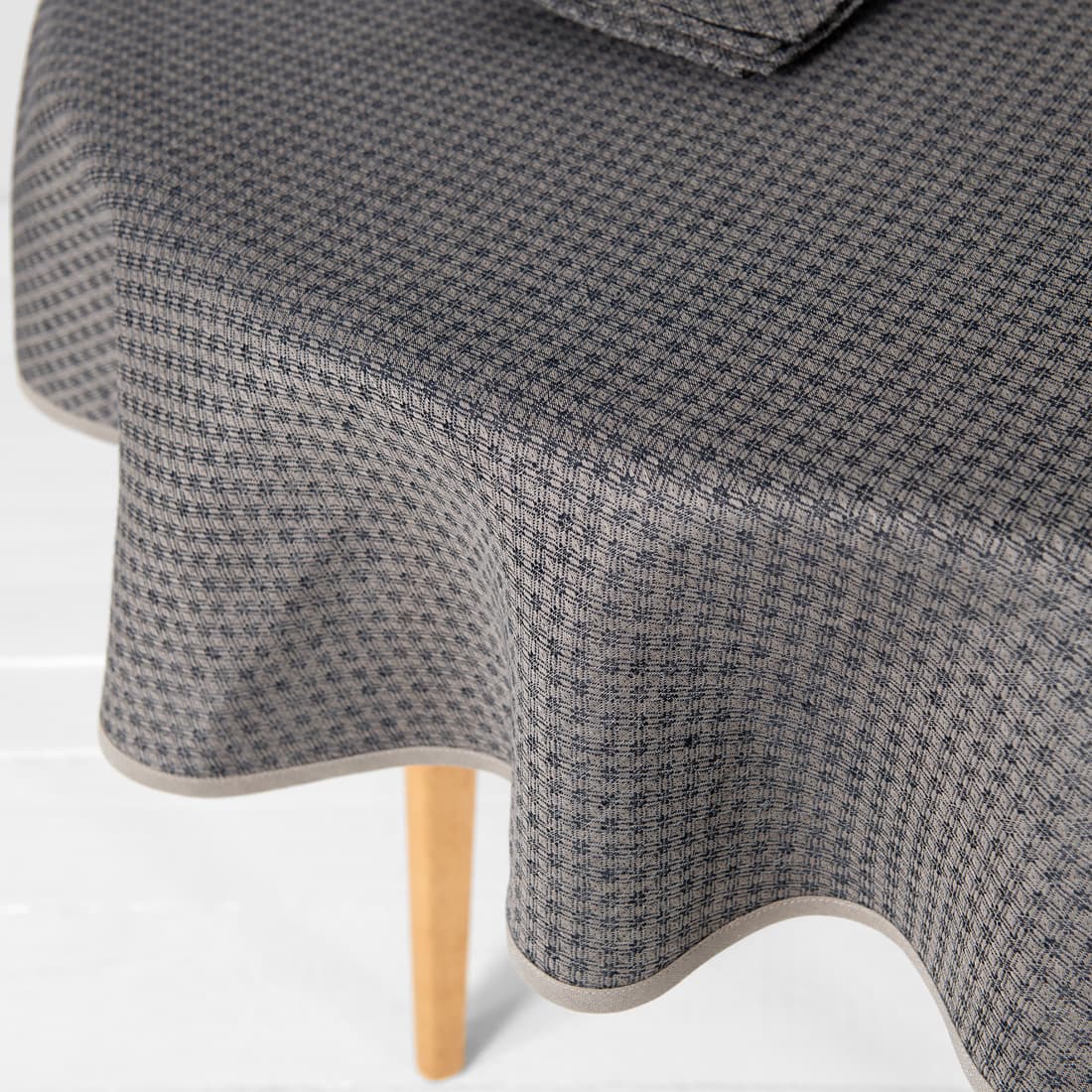 • TONY halvlin rund (oval) mørkeblå-beige duk og servietter