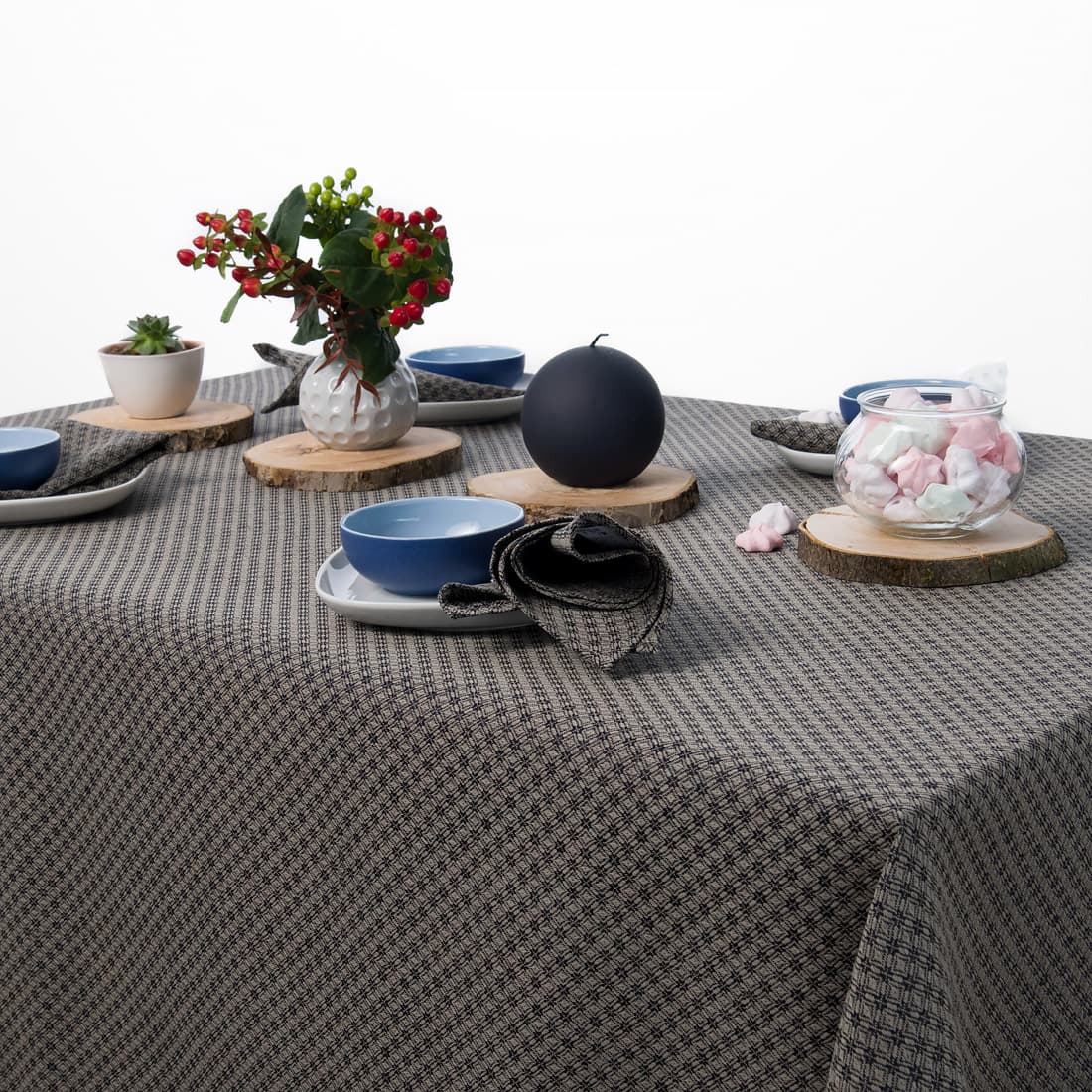Mønstret duk av lin/bomull, vevd i mørkeblå og grå romber. Blåaktig grå duk vil dekorere bordet til lunsj eller spesielle anledninger. Servietter av samme stoff og farge passer godt med denne duken.