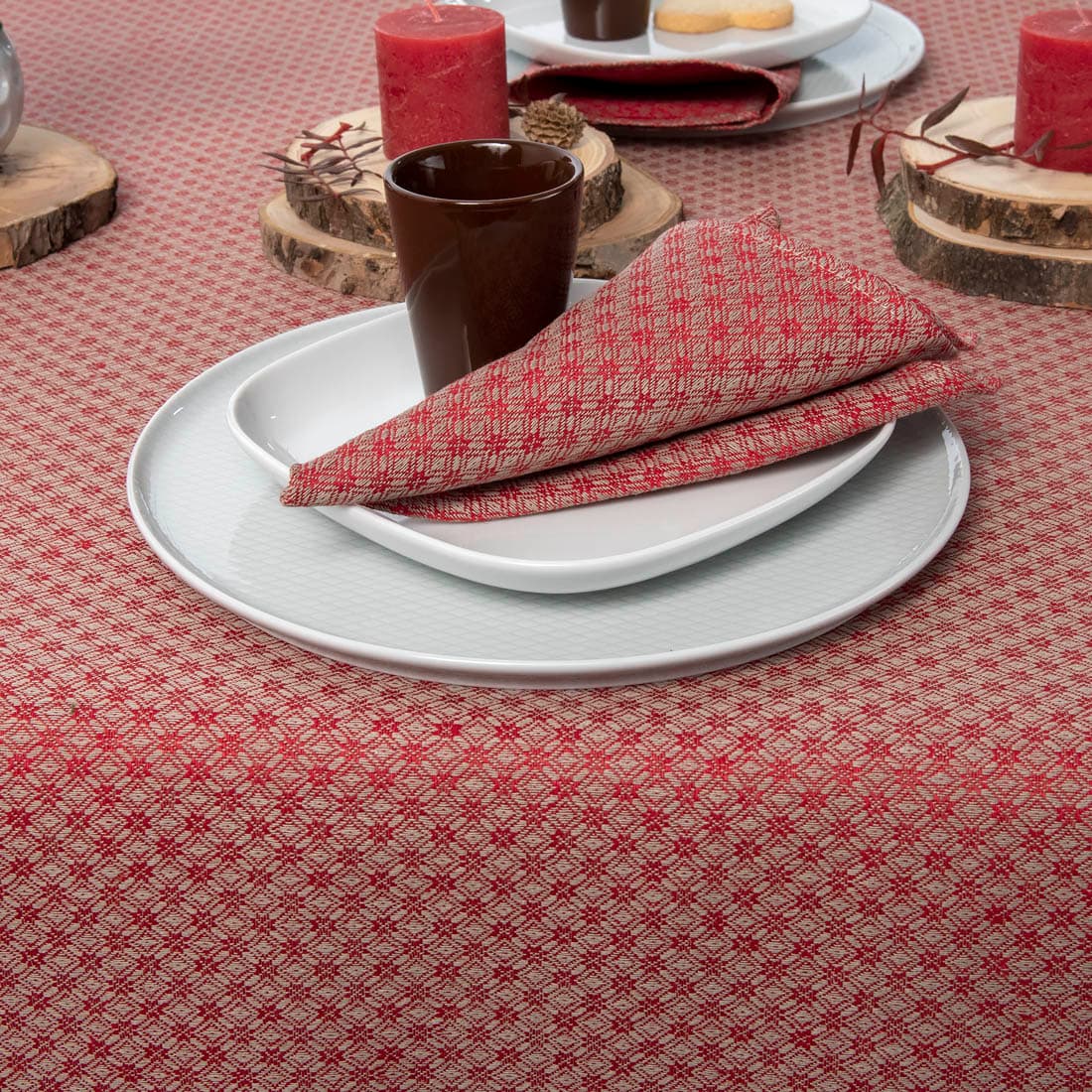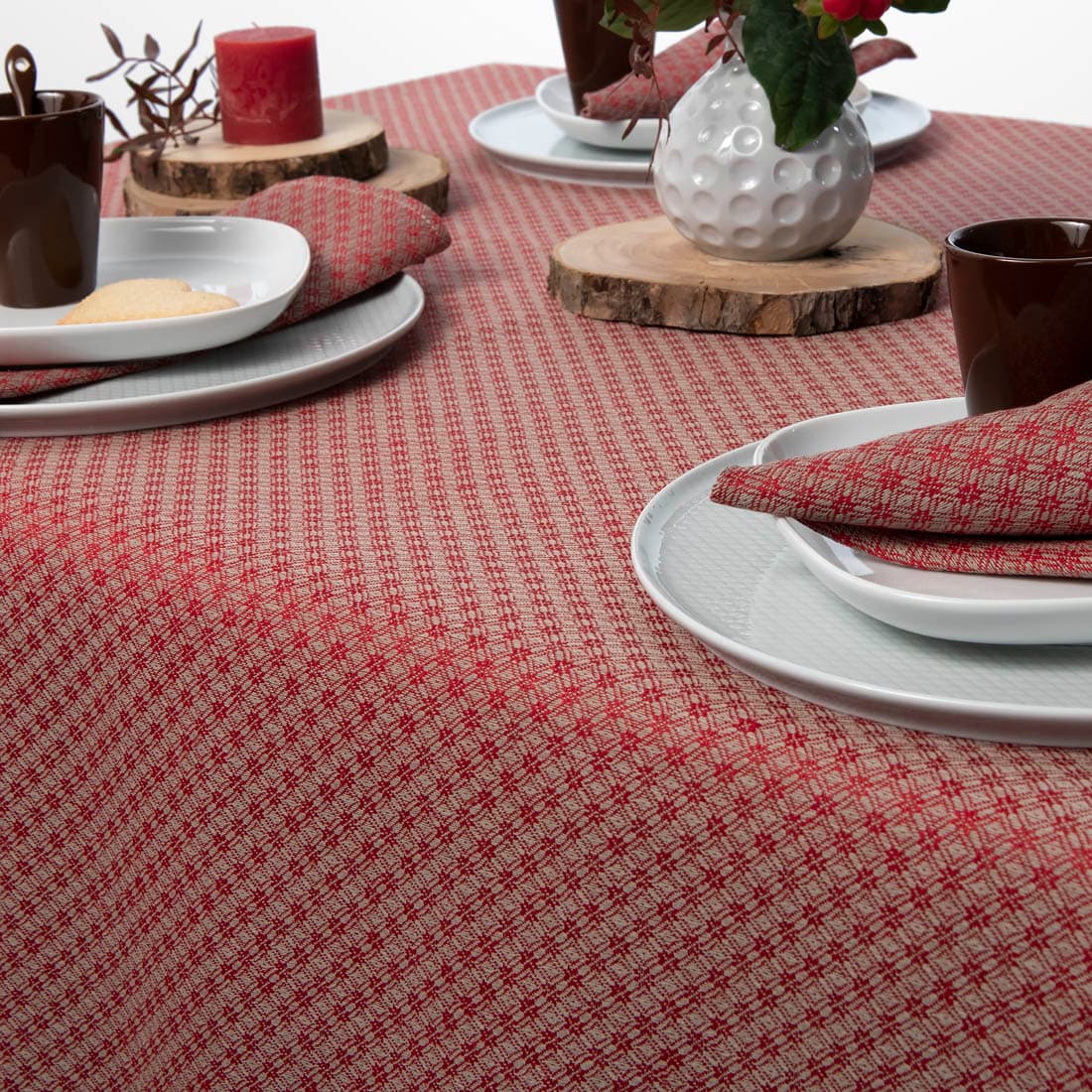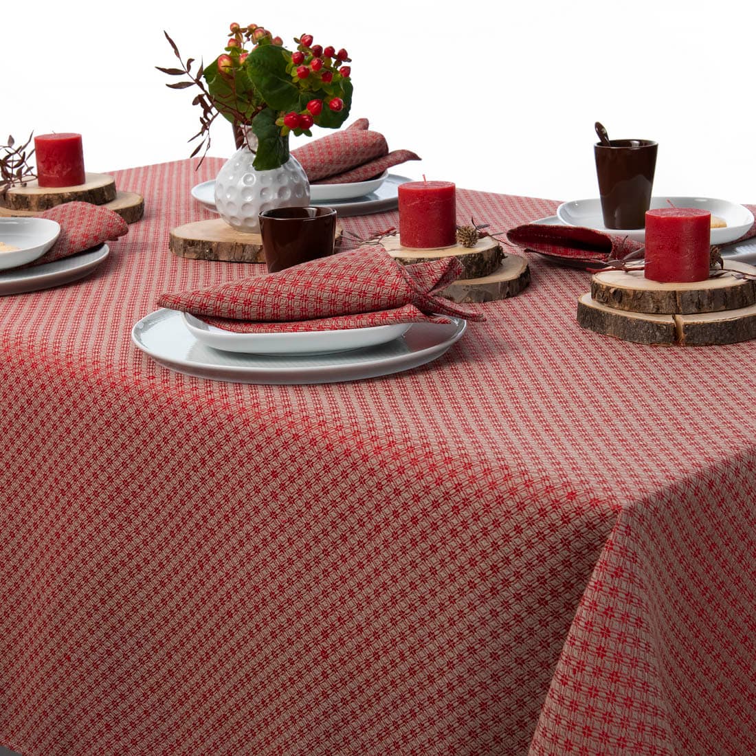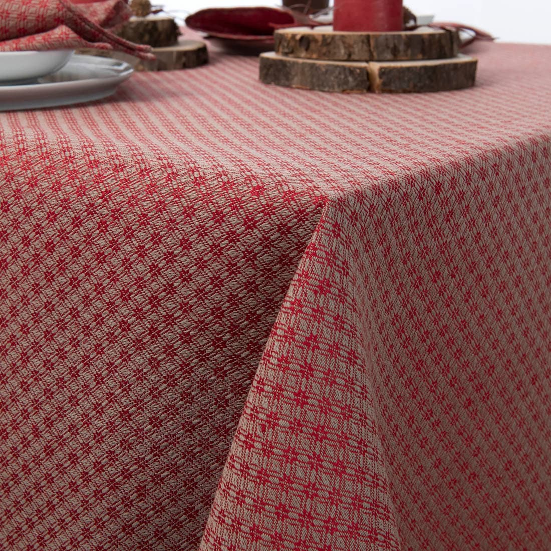 Mønstret duk av lin/bomull, vevd i rød og grå romber. Rød duk vil dekorere bordet til lunsj eller spesielle anledninger. Servietter av samme stoff og farge passer godt med denne duken.