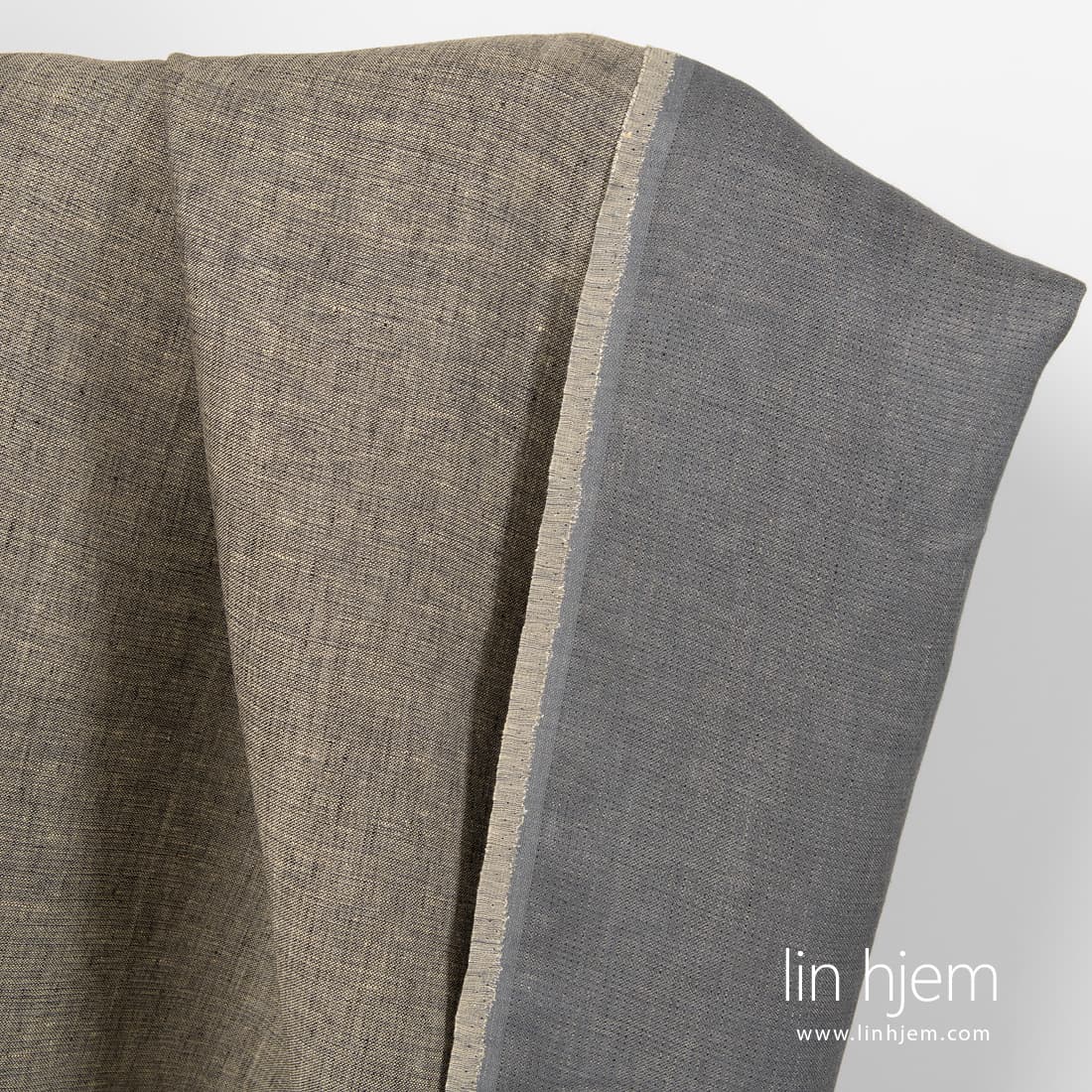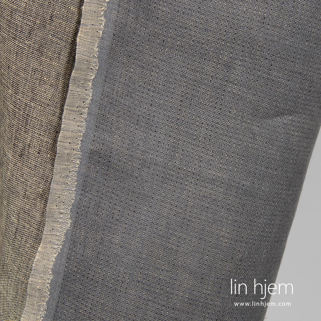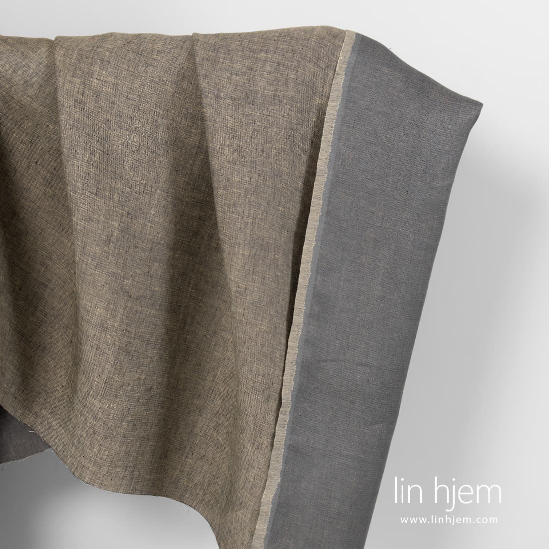 Tosidig brunt-grått linstoff vevd av svarte, mørkegrå og gulaktig brune garn. Tettvevd, holdbart, middels tykkelse. Passer perfekt til å sy klær, hjem tekstil produkter. Begge sidene kan brukes.