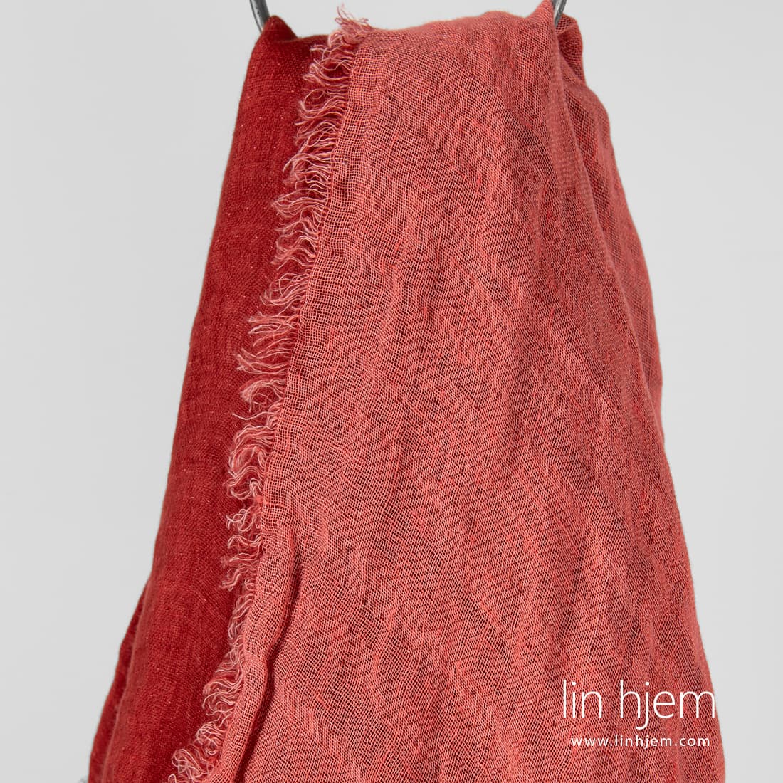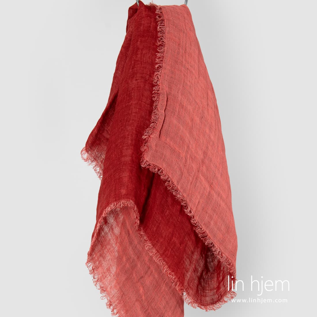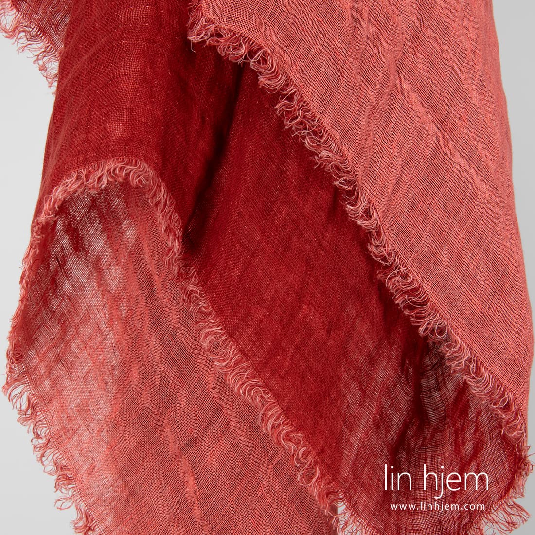 TWINA rødt skjerf av tosidig stoff. Produktets stoff ble vevd av rødaktig og røde garn. Spesielt vasket stoff som er mykt, skånsomt og behagelig mot huden. Sidene er dekorert med 2cm lange frynser.