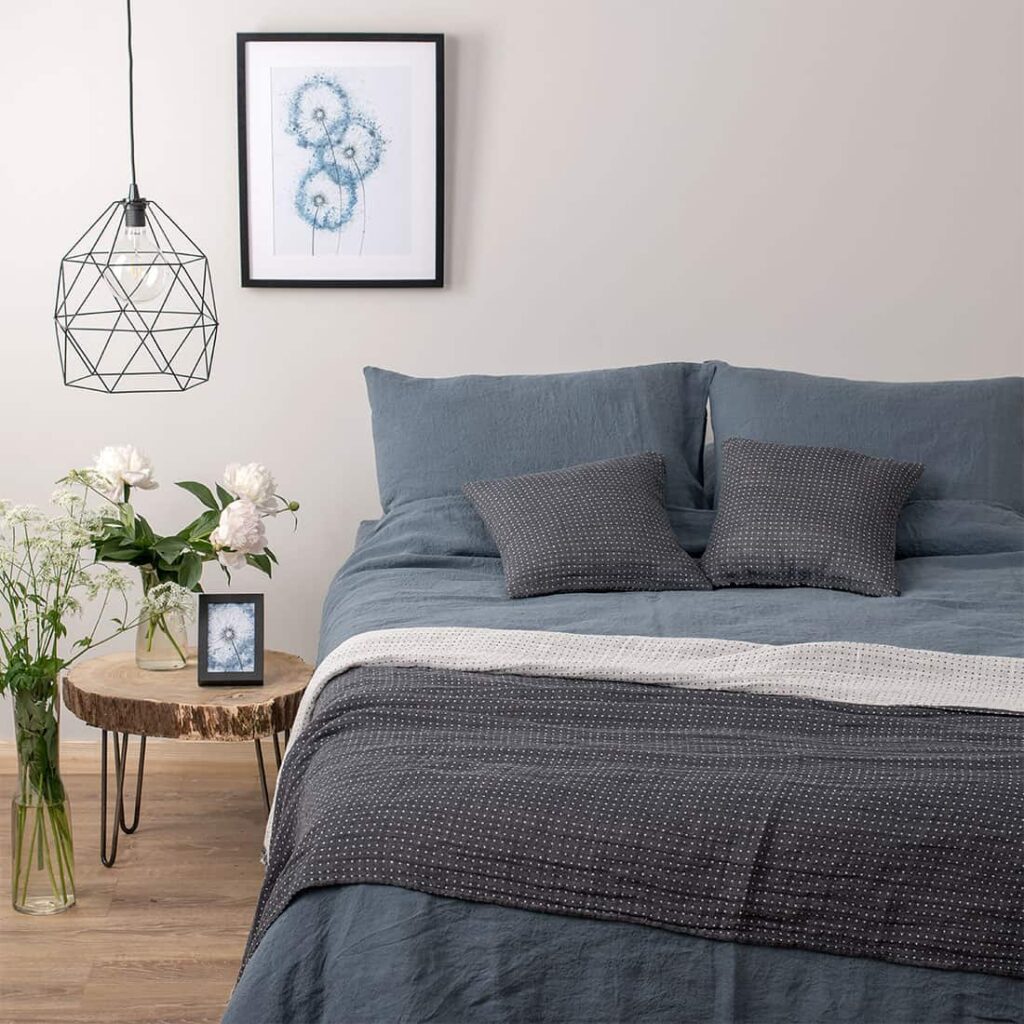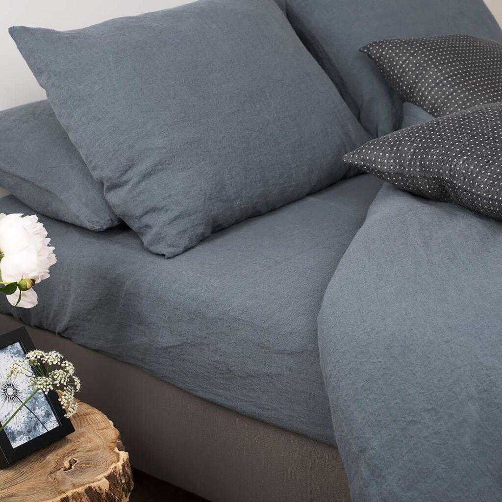 Mørk blågrått formsydd laken laget av spesialvasket linstoff. Spesialvask gjorde dette lette, tettvevde stoffet mye mykere og mer skånsomt, samt krympebestandig. Med dette myke lakenet er behagelig hvile garantert. Kan brukes alene eller kombineres med resten av kolleksjonen «Graffiti».