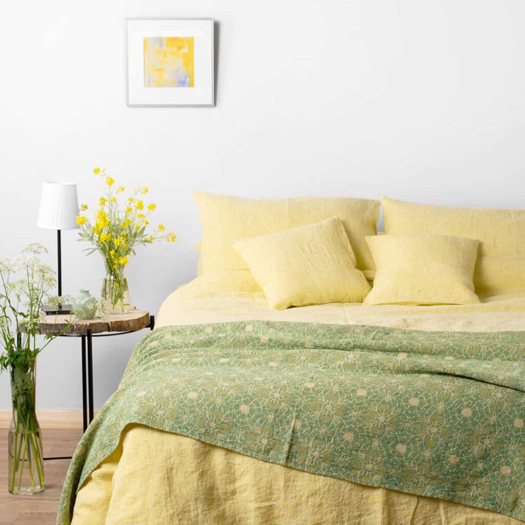 Gult vasket lin putetrekk med klaff.