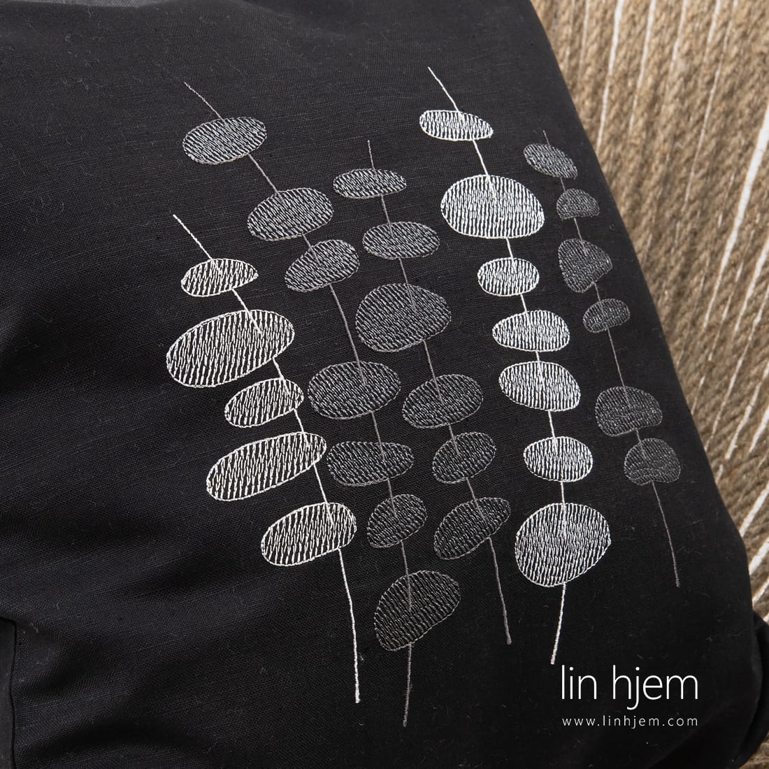 Halvlin putetrekk i svart farge mønstret med hvite og grå plantemotiver. Laget med glidelås. Dekorer sin sofa med våre putetrekk. Rett fra produsenten til en god pris.