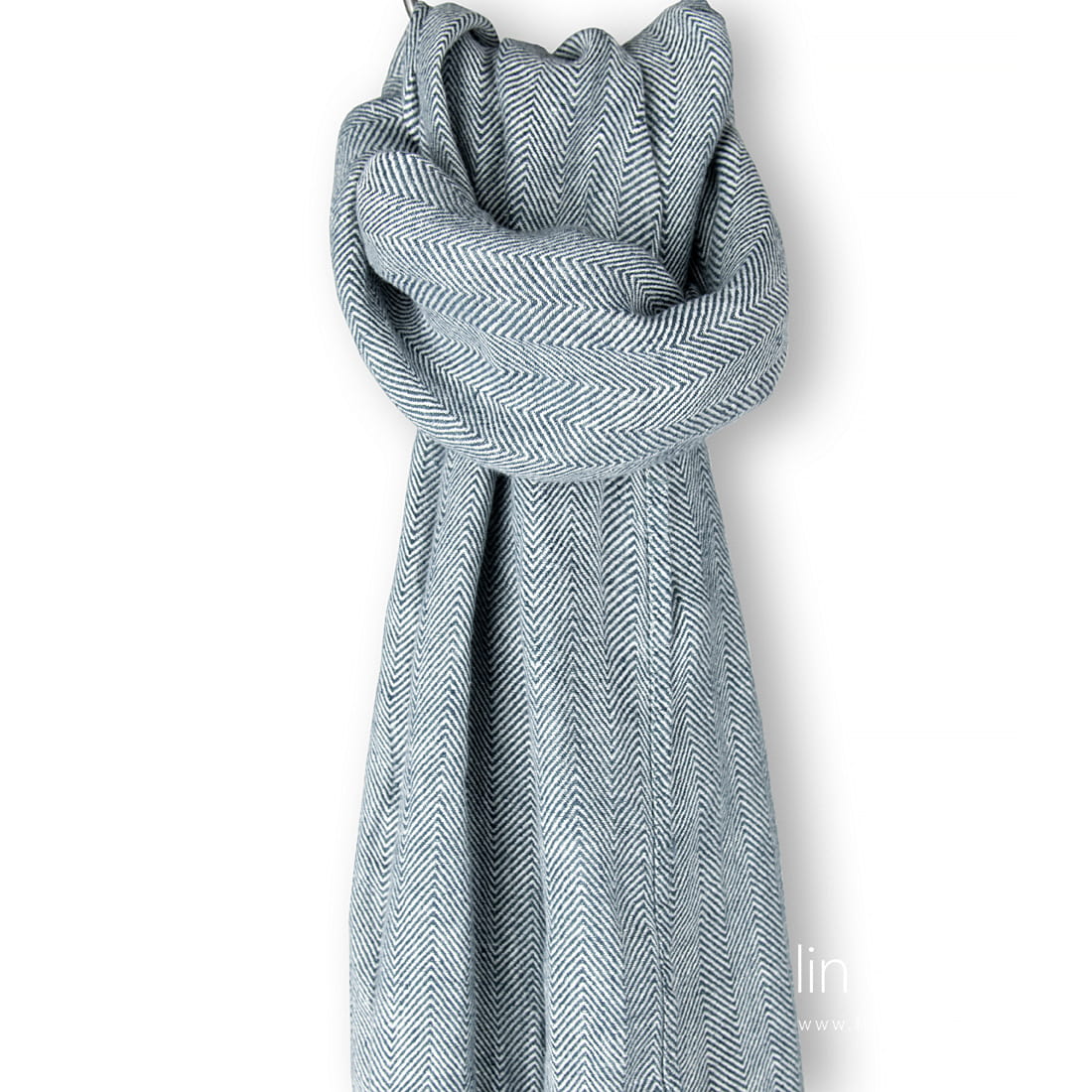 Blått sjal i lin med "gran" mønster vevd fra melkehvite og mørkeblå garn. Kortsidene dekorert med 2,5cm lange frynser. Produktets stoff er spesielt vasket for å gjøre det mykt og skånsomt. Dette sjalet passer både til menn og kvinner.