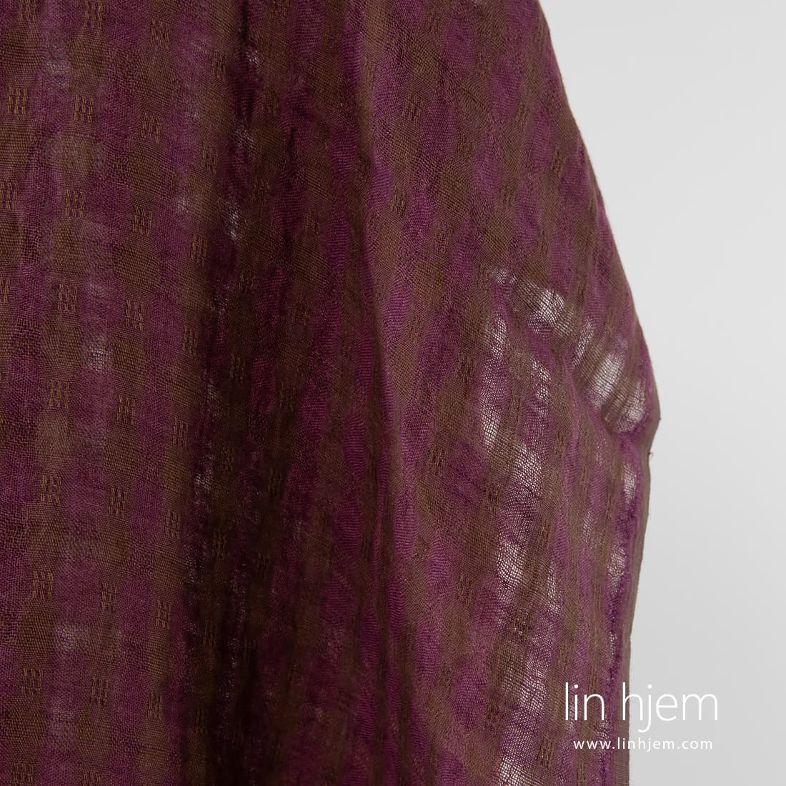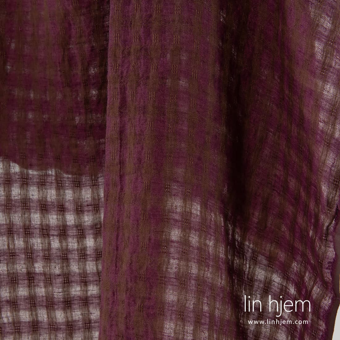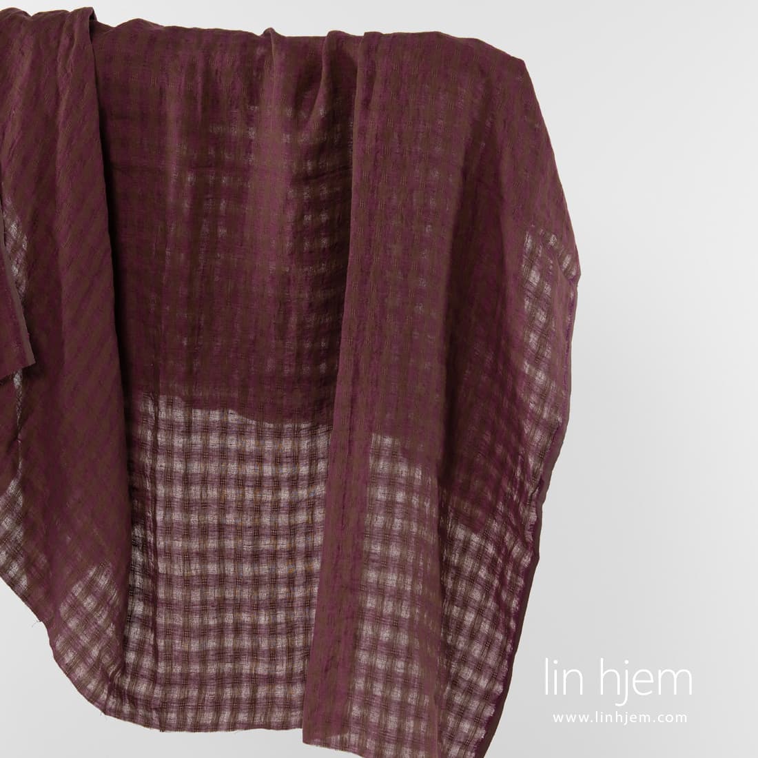 Vasket brunt-lilla linstoff i ruter. Lett, løstvevd, gjennomsiktig. Dette linstoff ble spesielt vasket for å gjøre det mykt, skånsomt og ikke minst behagelig mot huden.