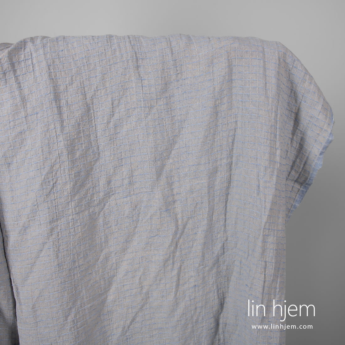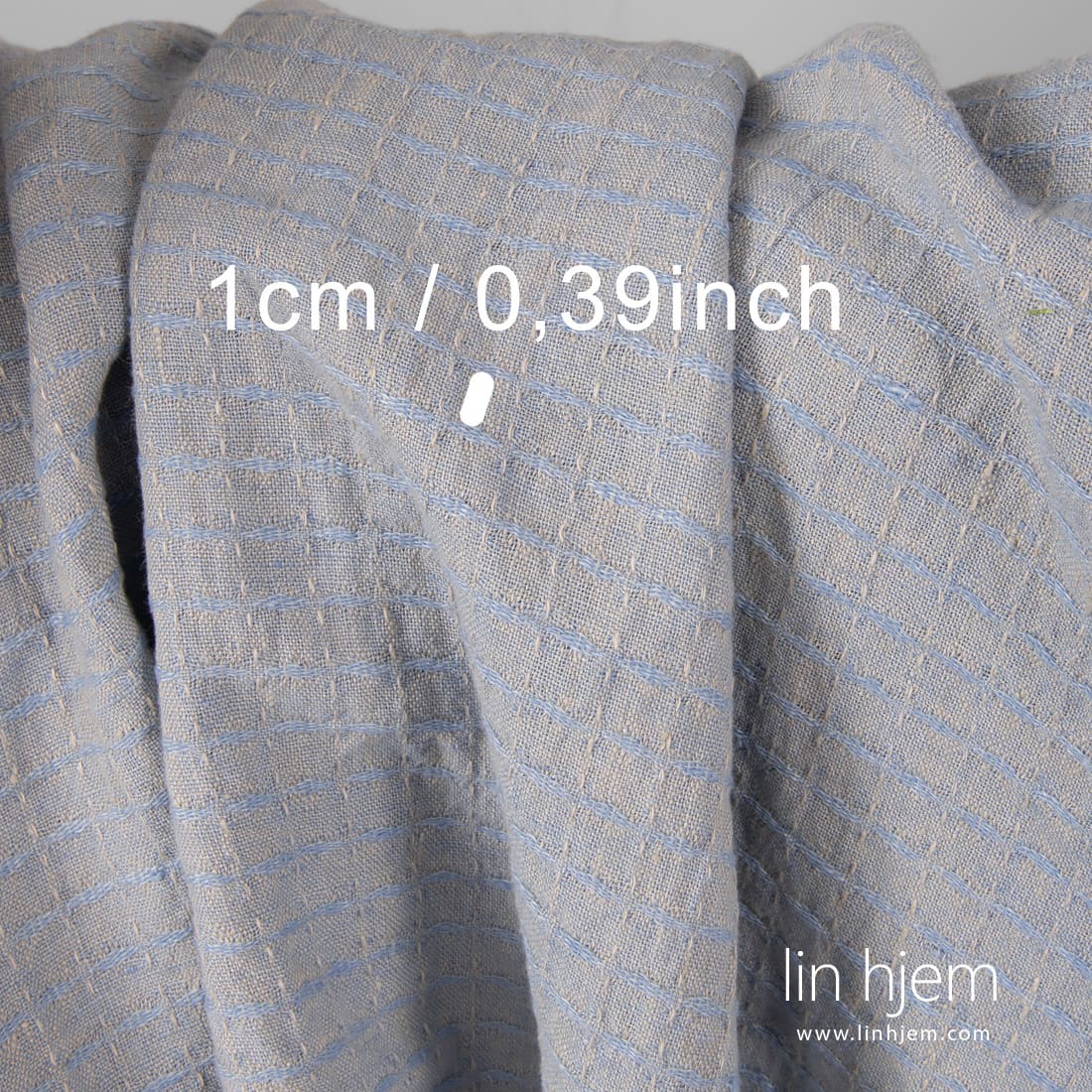 Vasket brunt linstoff i ruter vevd fra brunaktig grå og lyseblå garn. Tettvevd, holdbart, tøft, middels tykkelse og vekt. Spesielt vasket stoff som er mykt og skånsomt.