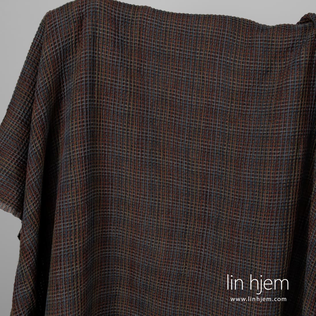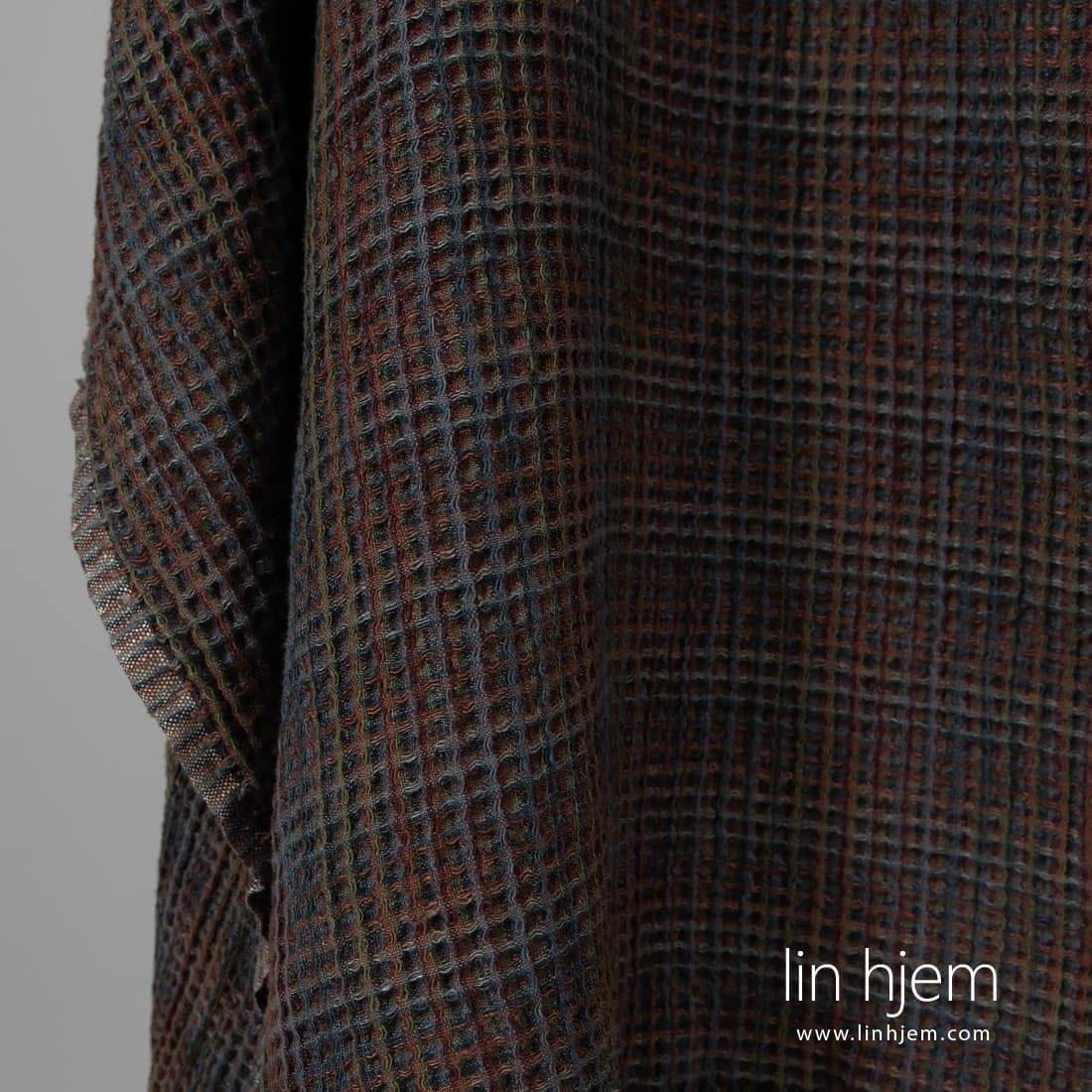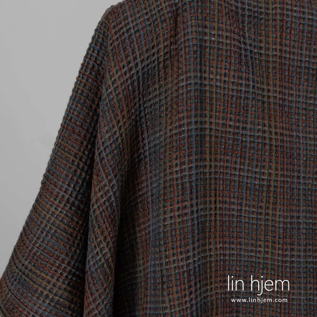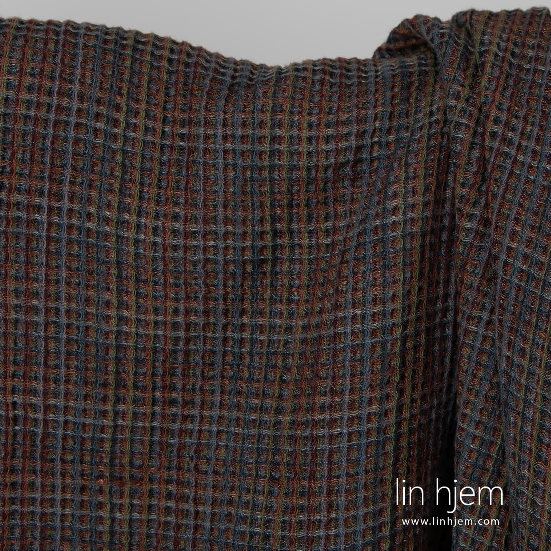 Vasket fargerikt "vaffel" halvlin stoff vevd av grå, mørkeblå, mørkelilla, brune, grå-brune, grønne og svarte lingarn. Spesielt vasket stoff som er mykt, skånsomt. Passer best til å sy kjøkkenhåndklær, badehåndklær, kåper.