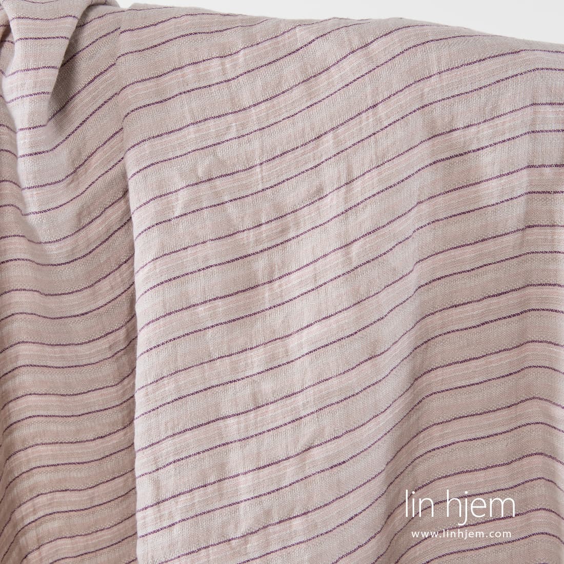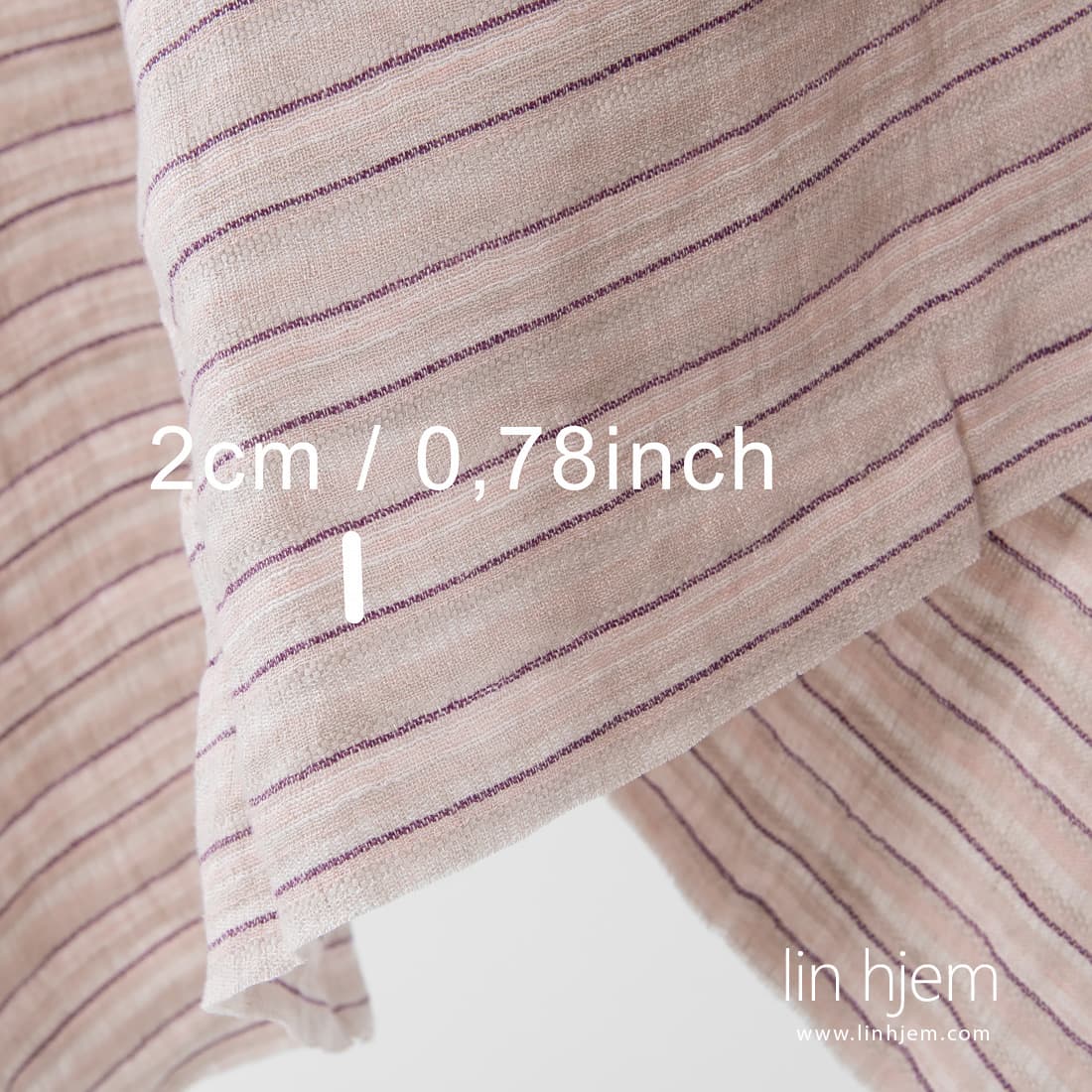 Vasket grått linstoff med rosa og lilla horisontale striper. Tettvevd, holdbart, middels tykkelse. Spesielt vasket for å gjøre dette linstoffet mykt, skånsomt og behagelig mot huden.
