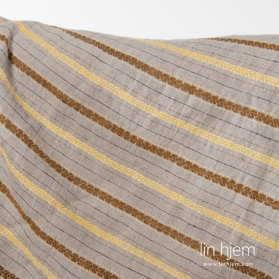 Vasket grått linstoff med horisontale mønstret gule og brune striper, svarte stiplede linjer. Holdbart, tettvevd, middels tykkelse. Spesielt vasket stoff som er mykt, skånsomt. Dette subtile linstoffet kan brukes til å sy klær og hjem tekstil produkter.