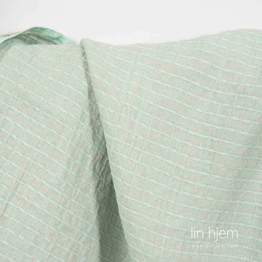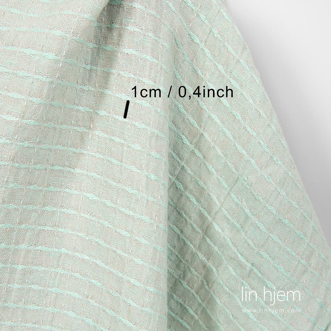 Vasket grønnaktig linstoff, mønstret. Stoffet ble vevd fra brunaktig grå og lysegrønne lingarn. Størrelse av en rute: 1cm x 1cm. Tettvevd, holdbart og middels tykkelse stoff. Vasket med spesielt teknologi som gjør dette 100% linstoff mykt og skånsomt.