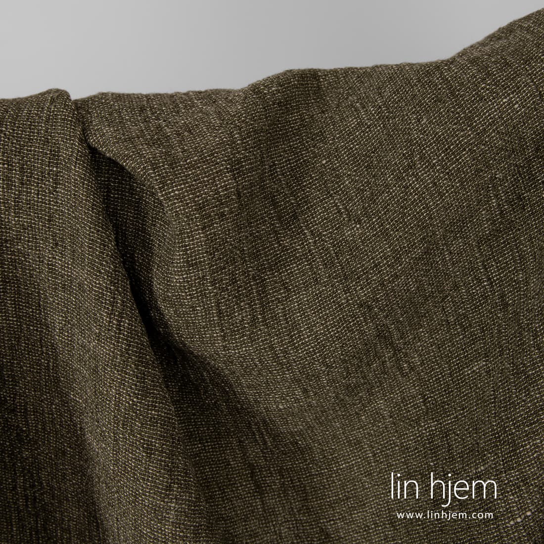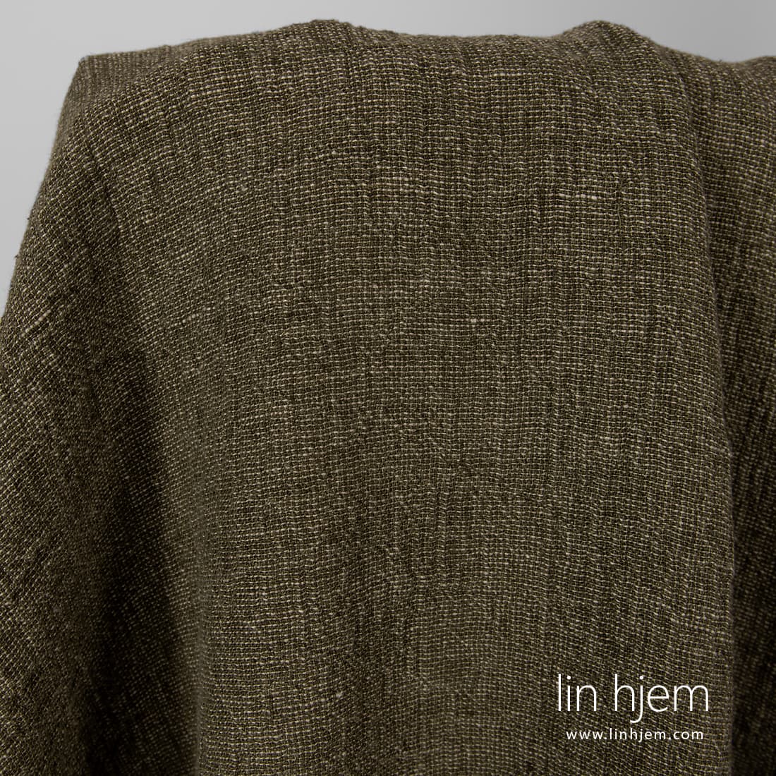 Vasket grønt linstoff i grå striper som ble vevd av ufarget naturlig lingarn. Tykt, holdbart, tettvevd, tungt stoff. Spesielt vasket med ny teknologi som gjør dette stoffet mykt, skånsomt. Passer til å sy klær, hjem tekstil produkter.