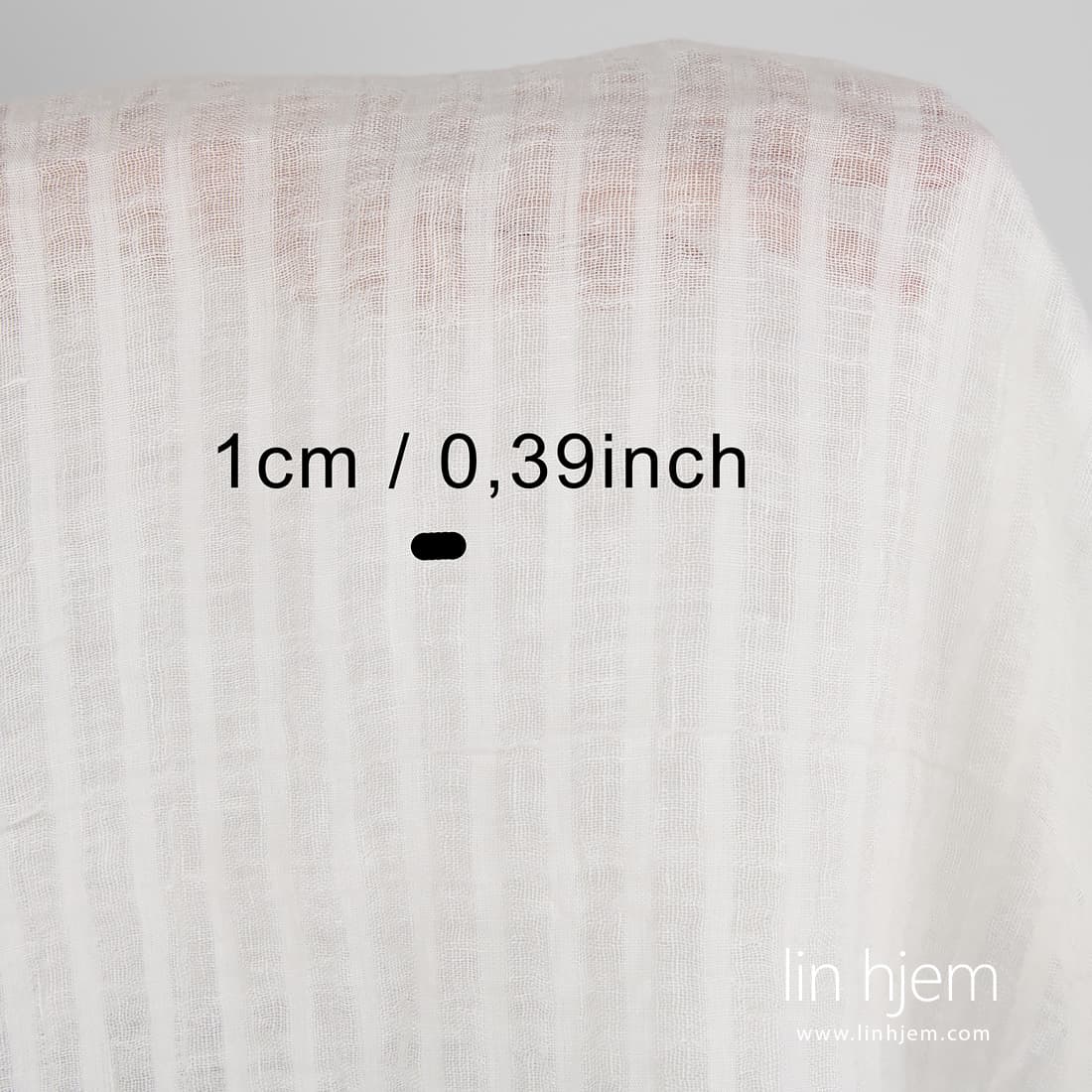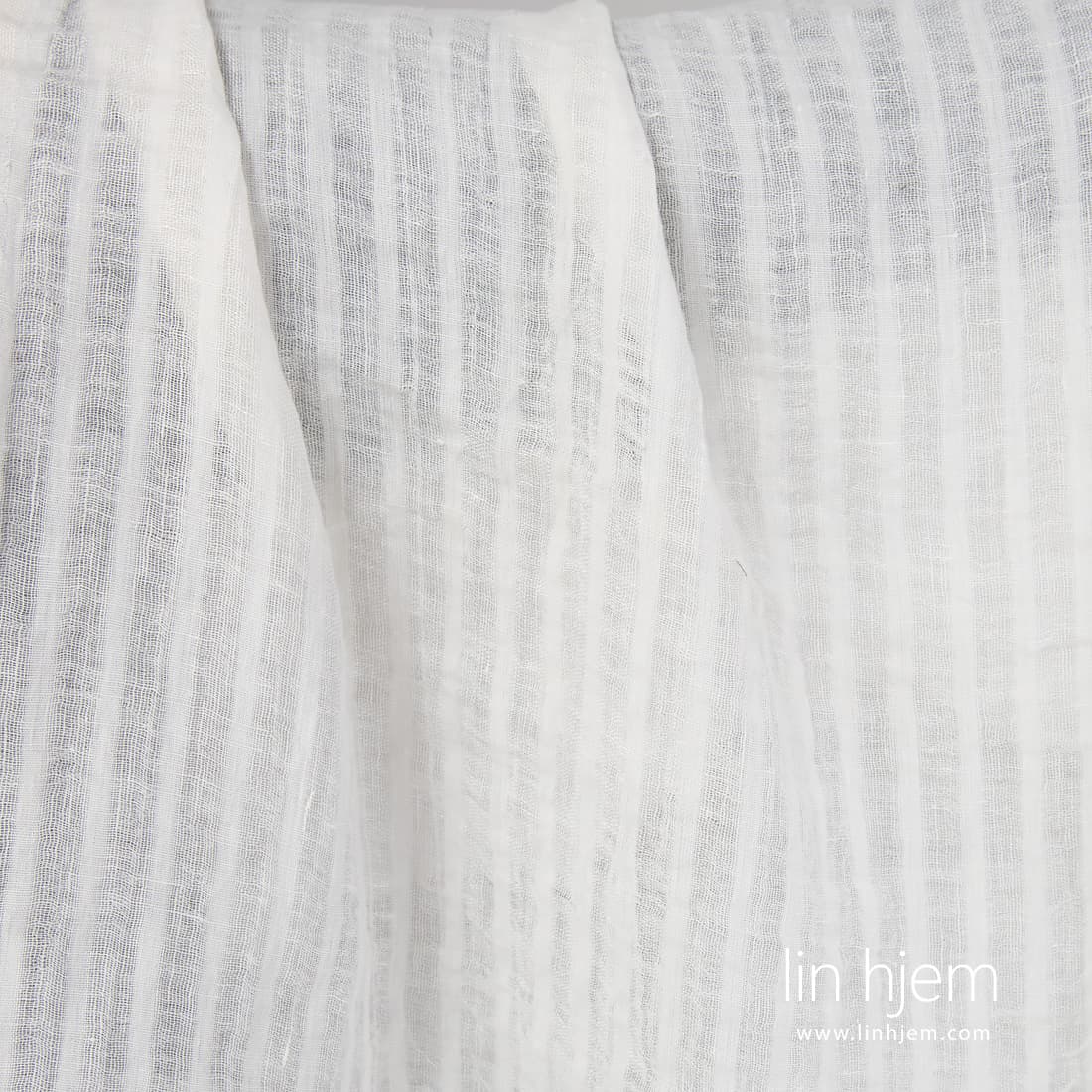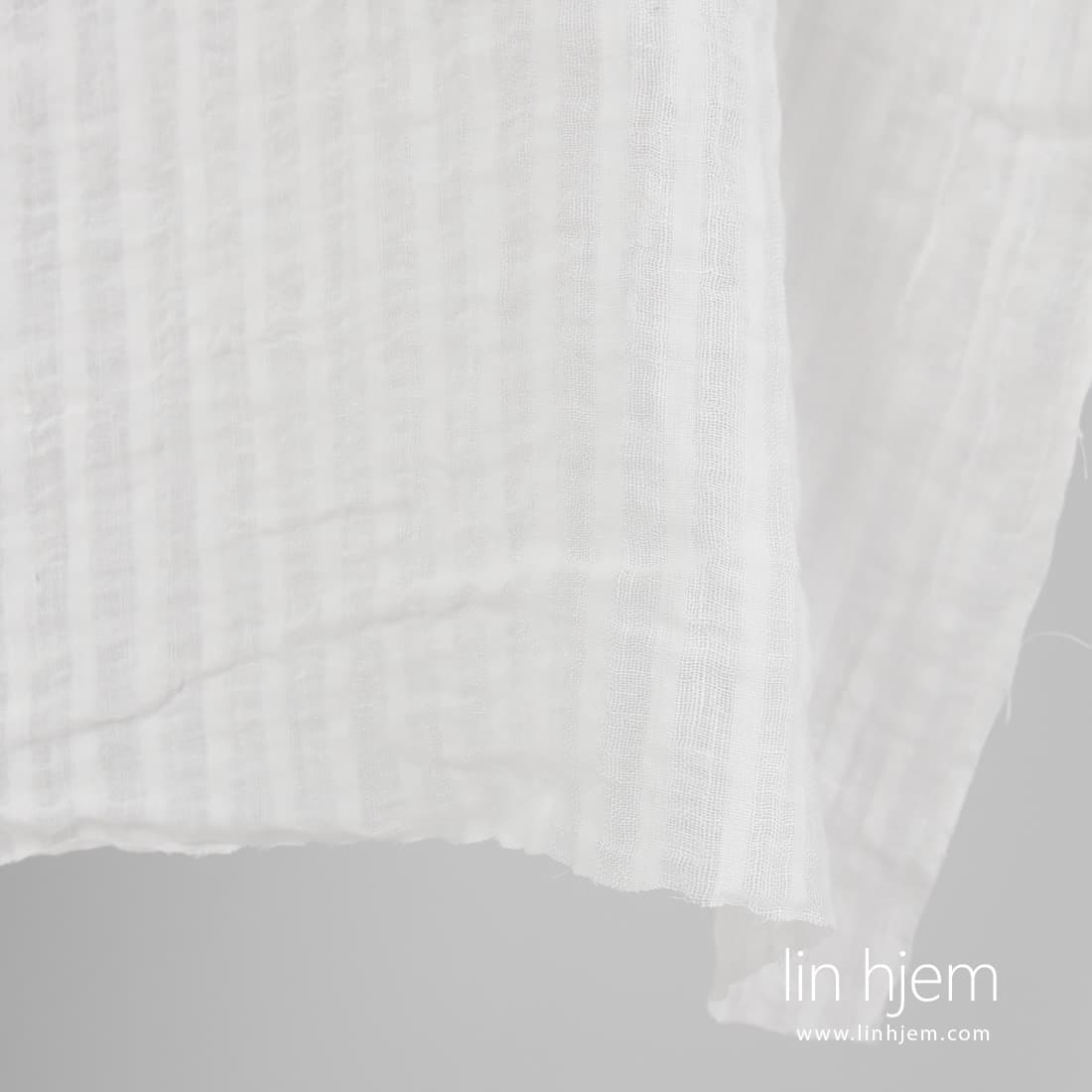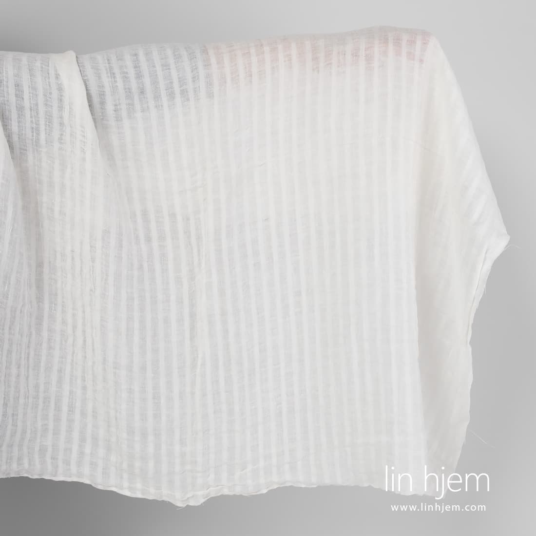 Vasket melkehvitt linstoff med gjennomsiktige og tettvevde vertikale striper. Spesielt vasket stoff som er mykt og skånsomt. Passer til å sy skjerf, gardiner.