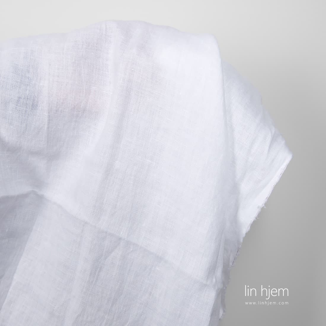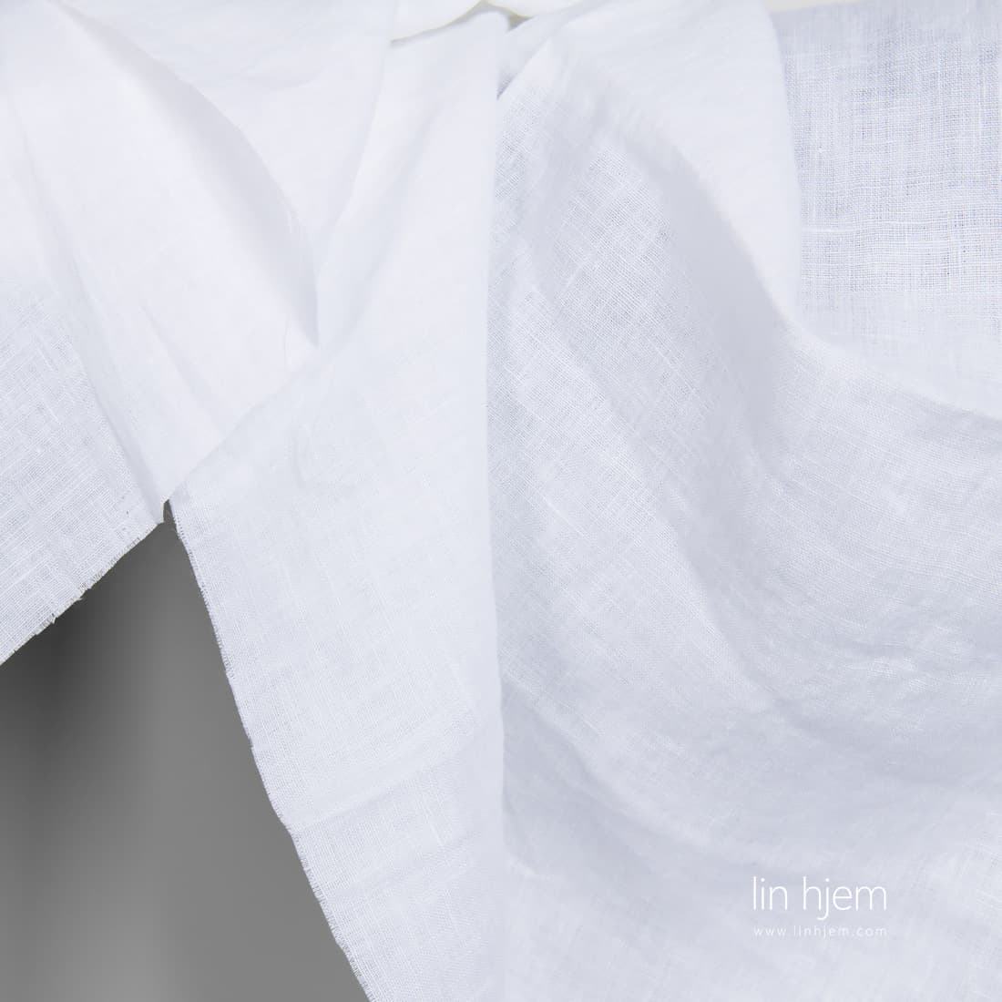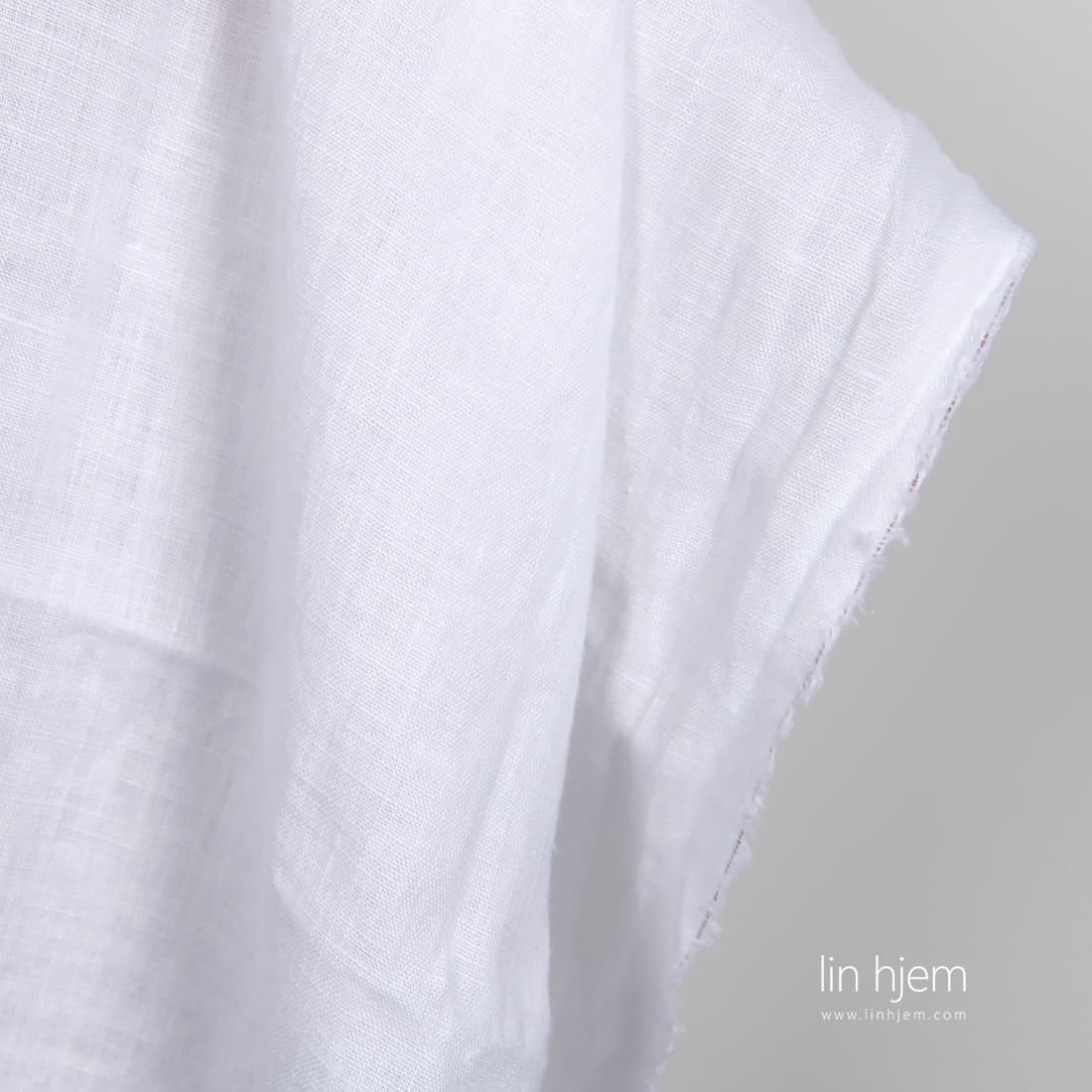 Vasket kritthvitt linstoff. Spesielt vasket stoff som er mykt, skånsomt, krymper ikke. Tettvevd, holdbart, lett, middels tykkelse.