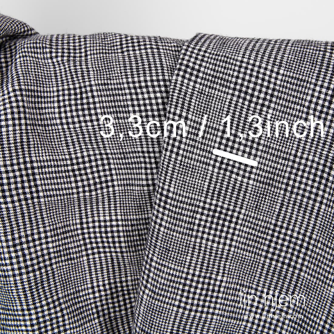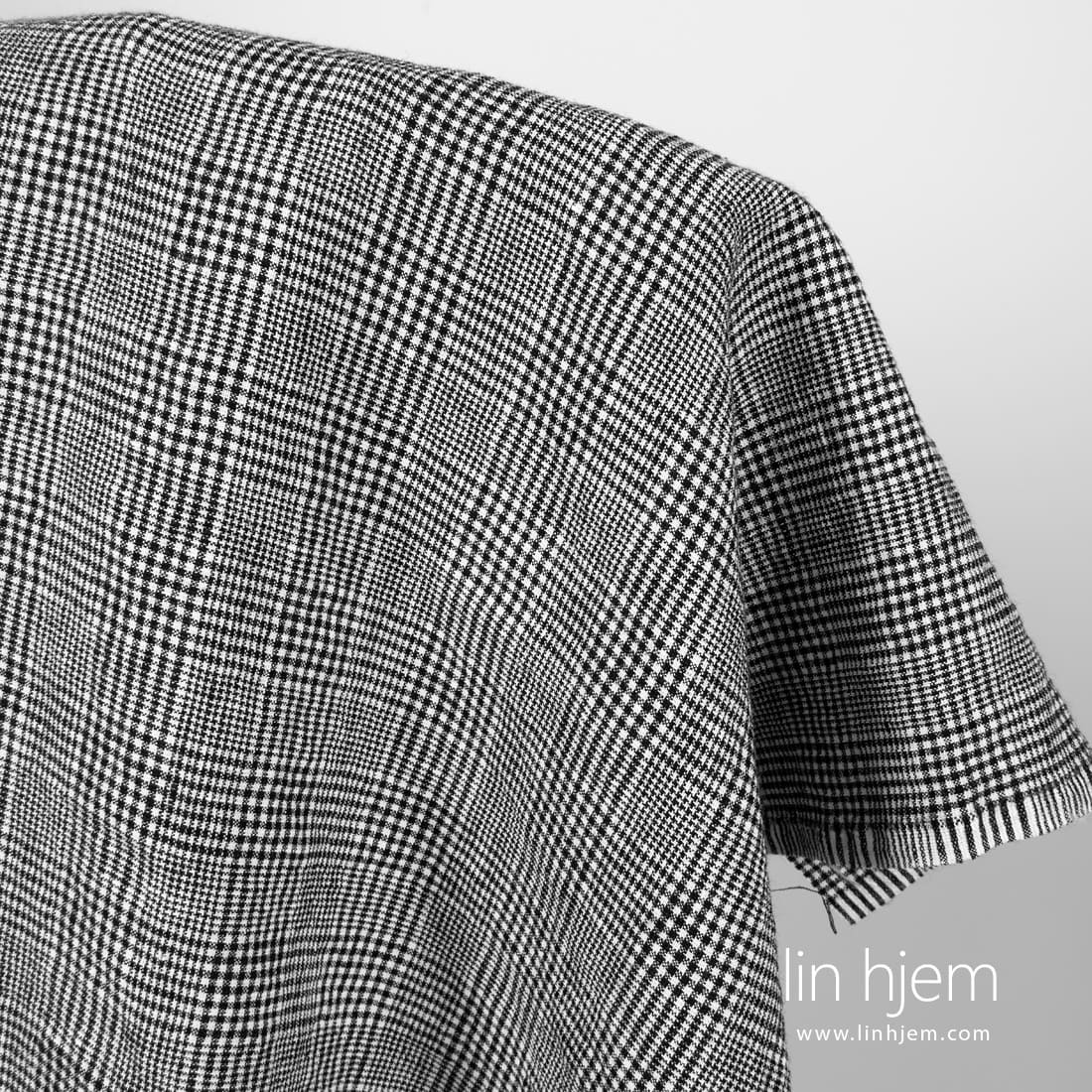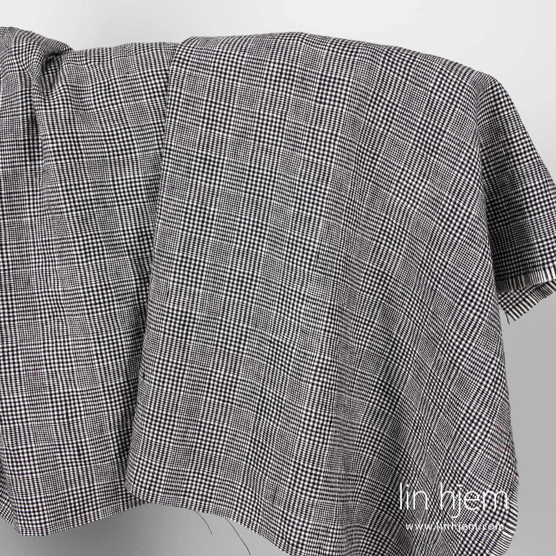 Vasket lin-ull stoff med svarte ruter som ble vevd fra melkehvite, svarte og mørkeblå garn. Tettvevd, tøft, holdbart og middels tykkelse stoff som er også spesielt vasket for å gjøre stoffet mykt, skånsomt. Passer til å sy skjerf, sjal, klær.