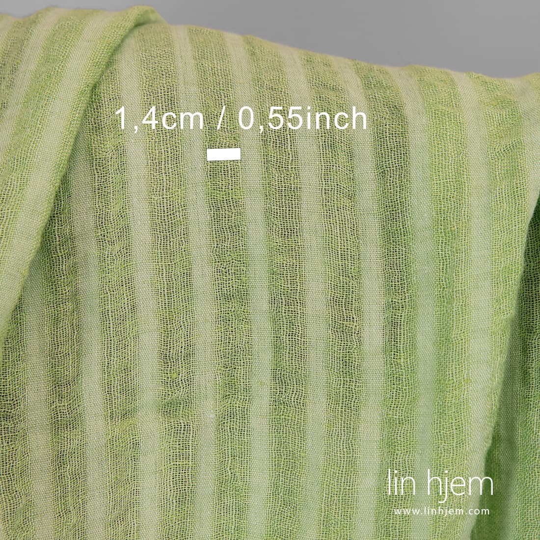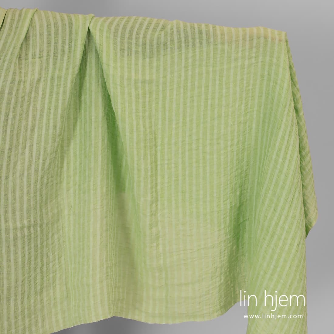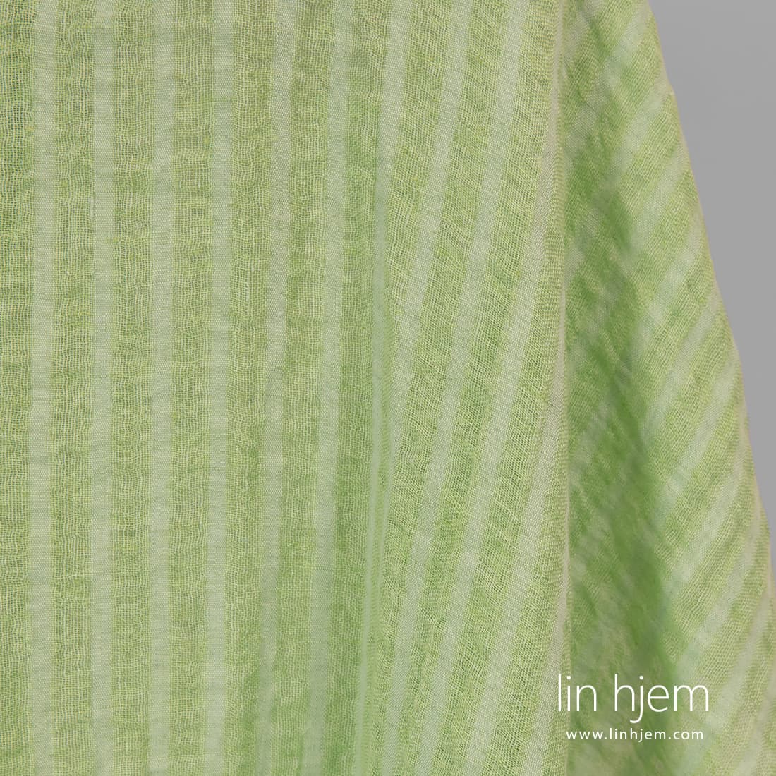 Vasket linstoff med vertikale lysegrønne striper. Stoffet ble vevd av lysegrønne og mint farget garn. Bredere striper er løstvevde. Dette stoffet er spesielt vasket derfor ekstremt mykt, skånsomt. Krymper ikke. Sy skjerf, gardiner, duker, servietter.