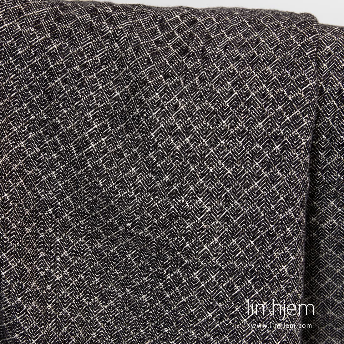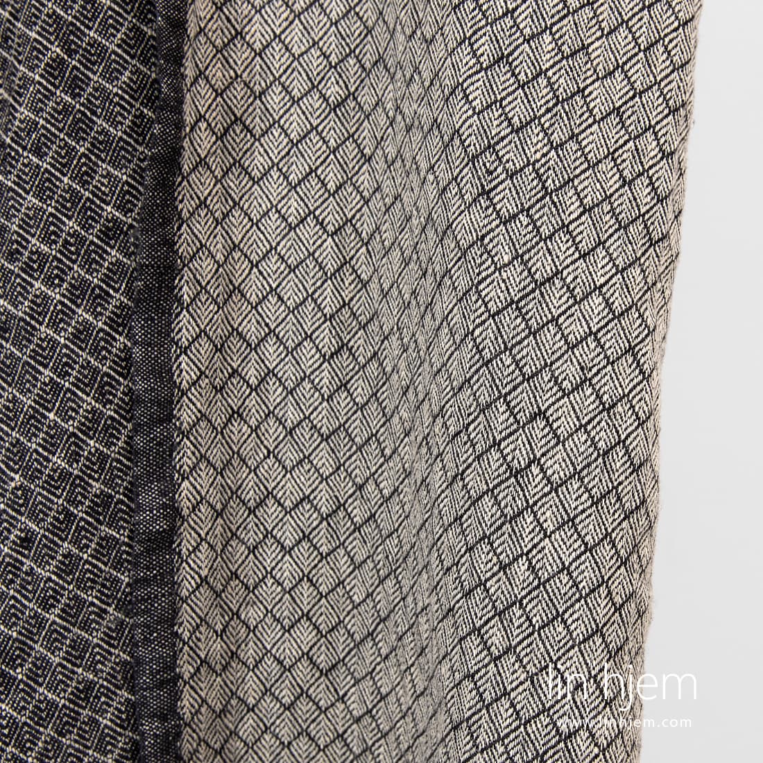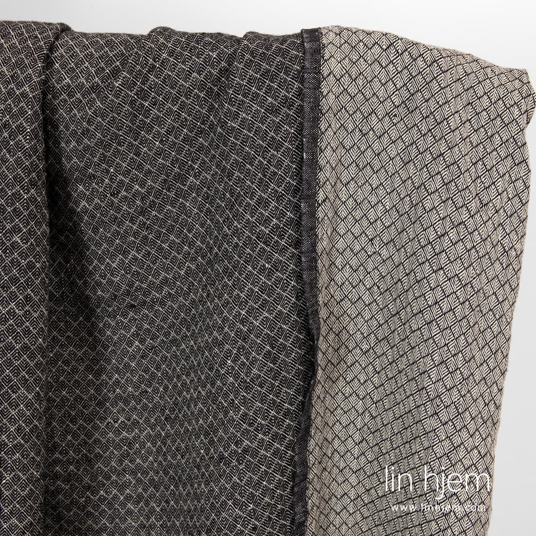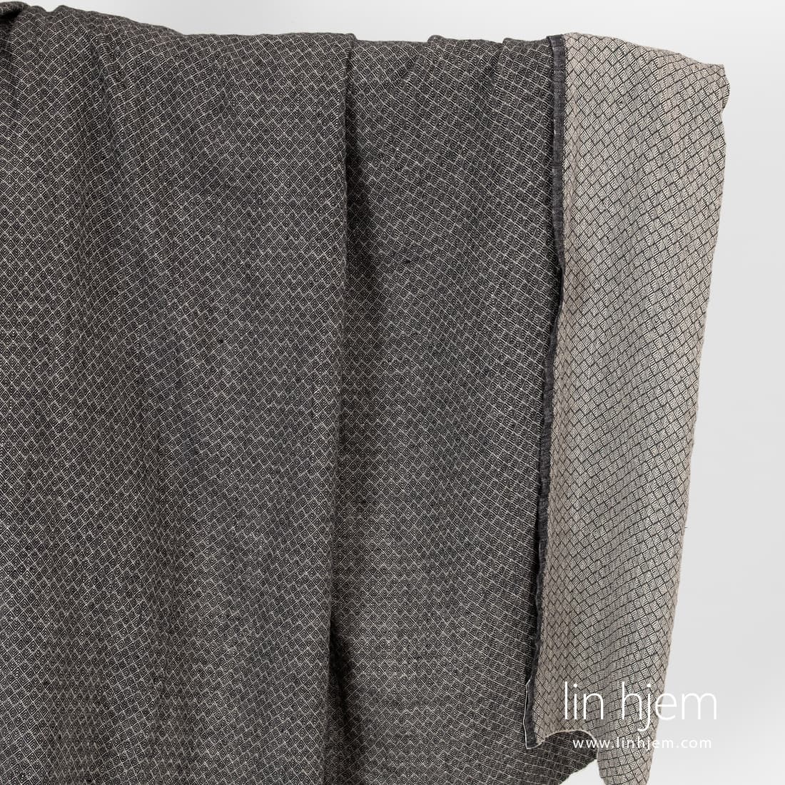 Vasket mønstret brunaktig svart linstoff, tosidig: den ene siden romber mønster vevd av svarte garn, den andre siden vevd av brunaktig grå garn. Dette stoffet er tungt, holdbart, tettvevd, middels tykkelse. Spesielt vasket stoff som er mykt, skånsomt. Sy klær, sjal, skjerf, putetrekk.