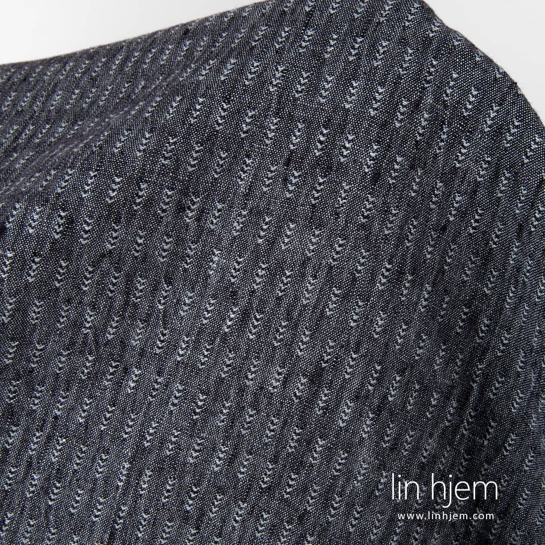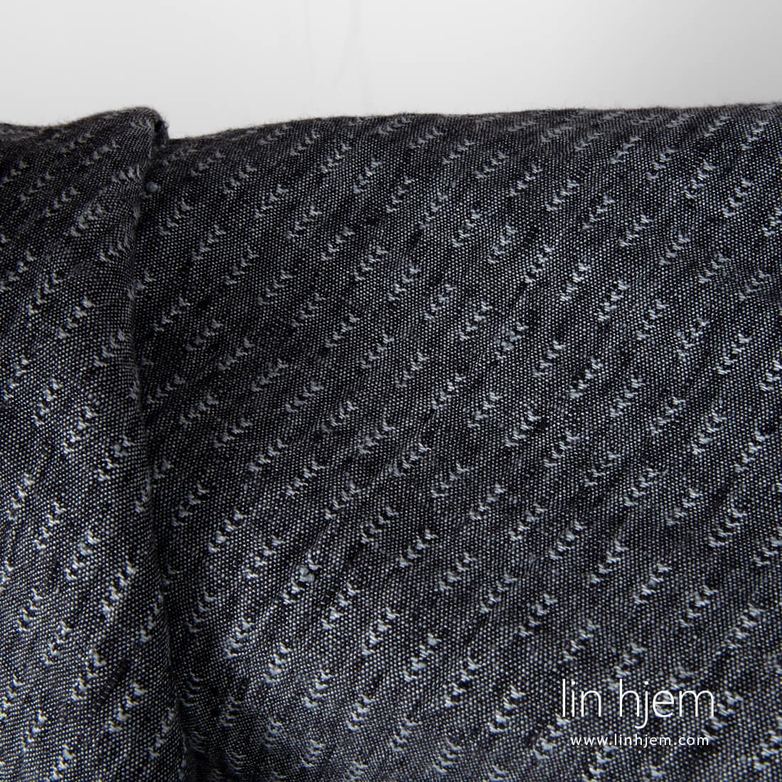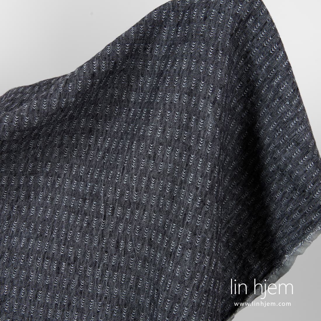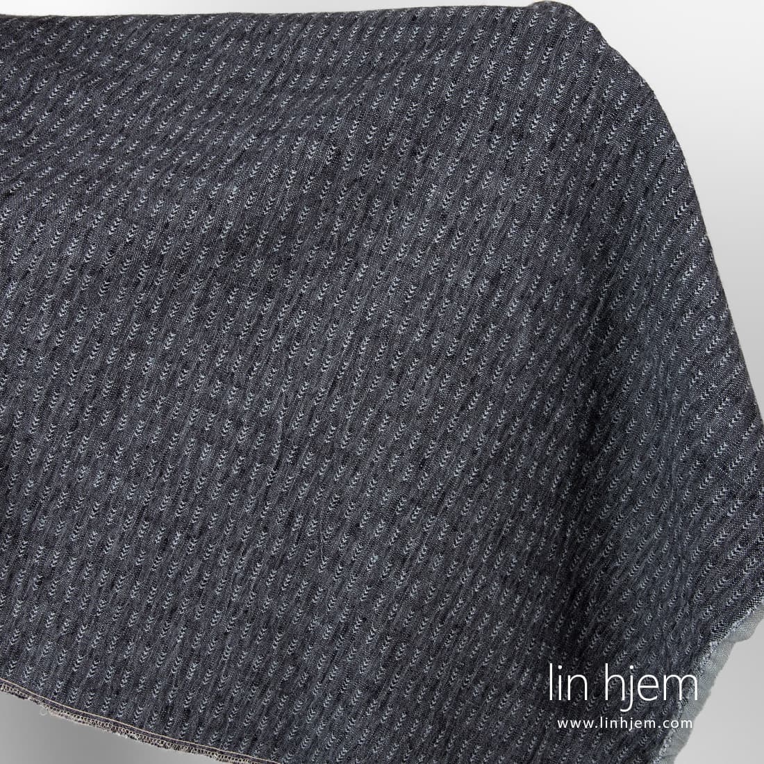 Vasket mønstret svart/grått linstoff vevd fra svarte og grå garn. Tettvevd, holdbart, tøft, ganske tungt, middels tykkelse. Spesielt vasket med ny teknologi som gir mykhet, skånsomhet. Krymper ikke. Fra dette dekorative stoffet kan dere sy klær og hjem tekstil produkter.