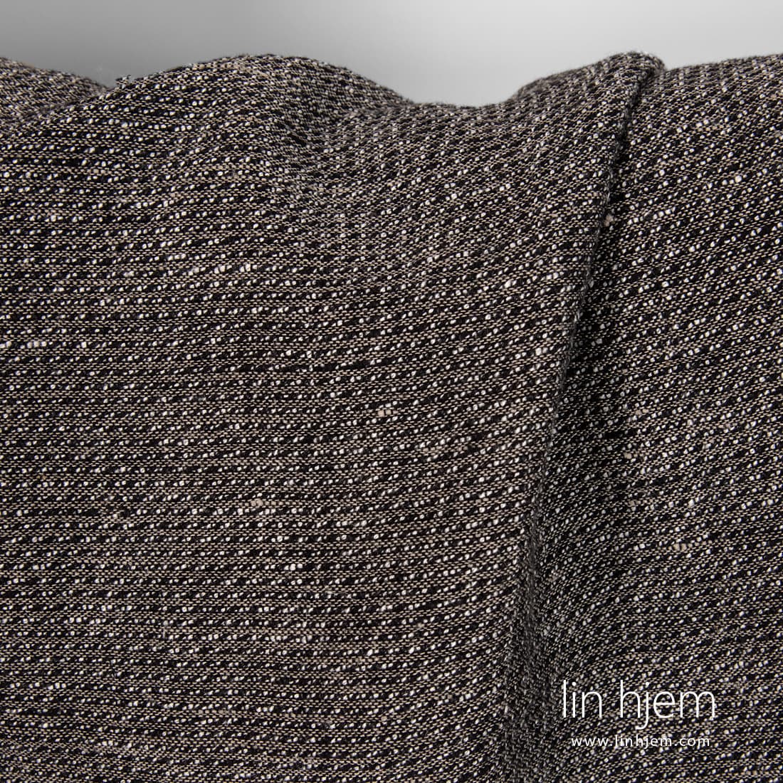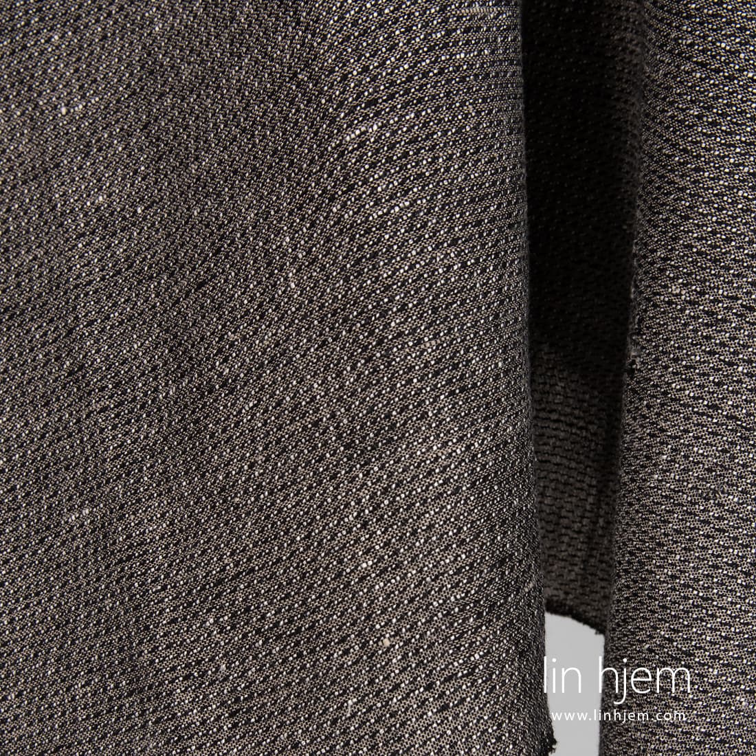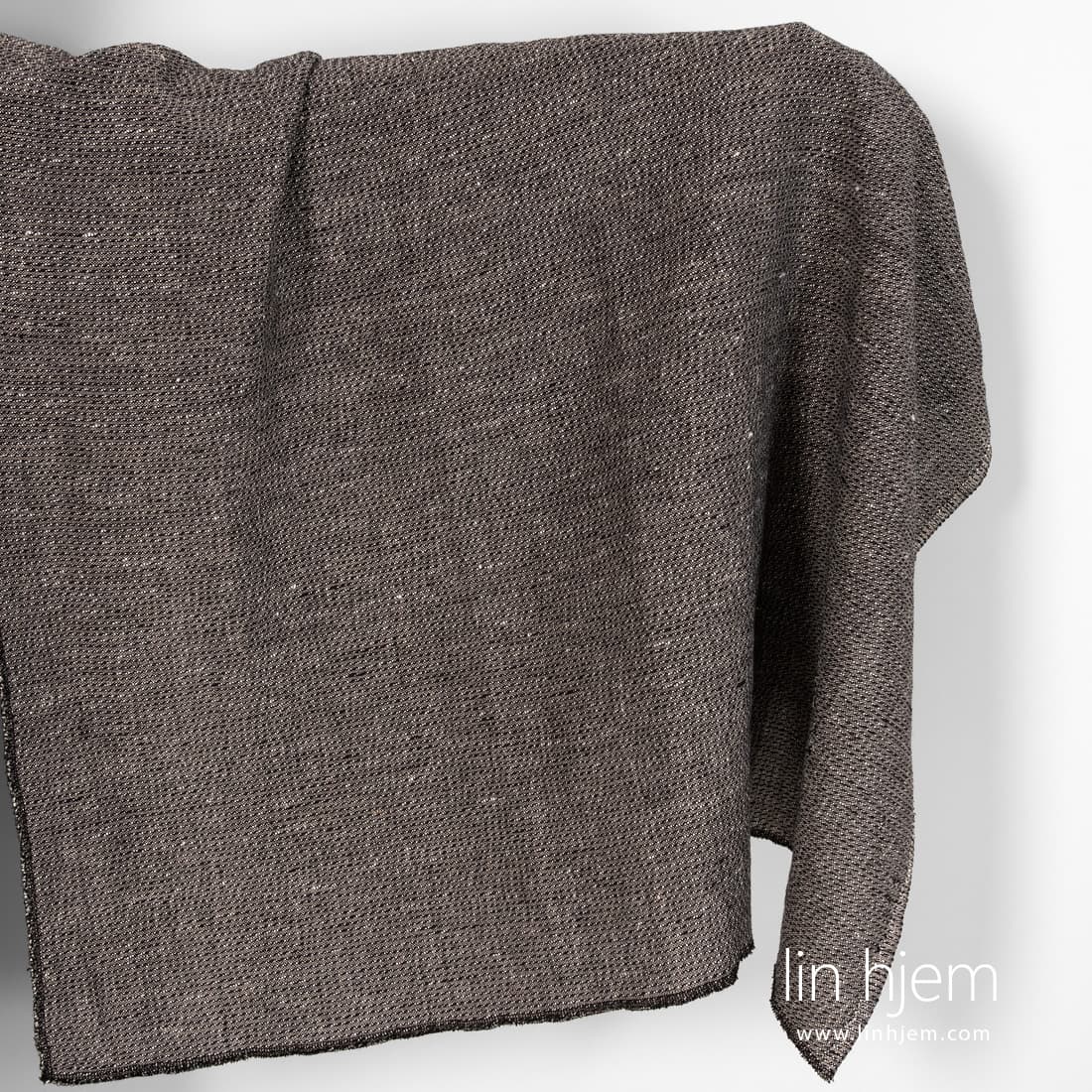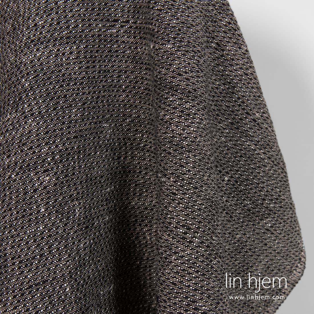 Vasket mønstret svart halvlin stoff. Vevd av svarte, hvite, naturlig (ufarget) lin og bomulls garn. Holdbart, tettvevd, middels tykkelse. Spesielt vasket stoff som er mykt, skånsomt. Passer best til å sy klær, sjal, skjerf, pledd.