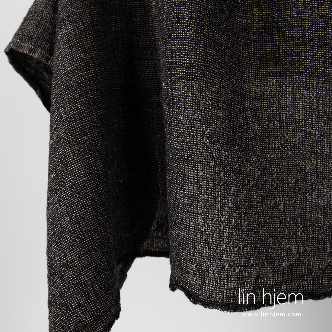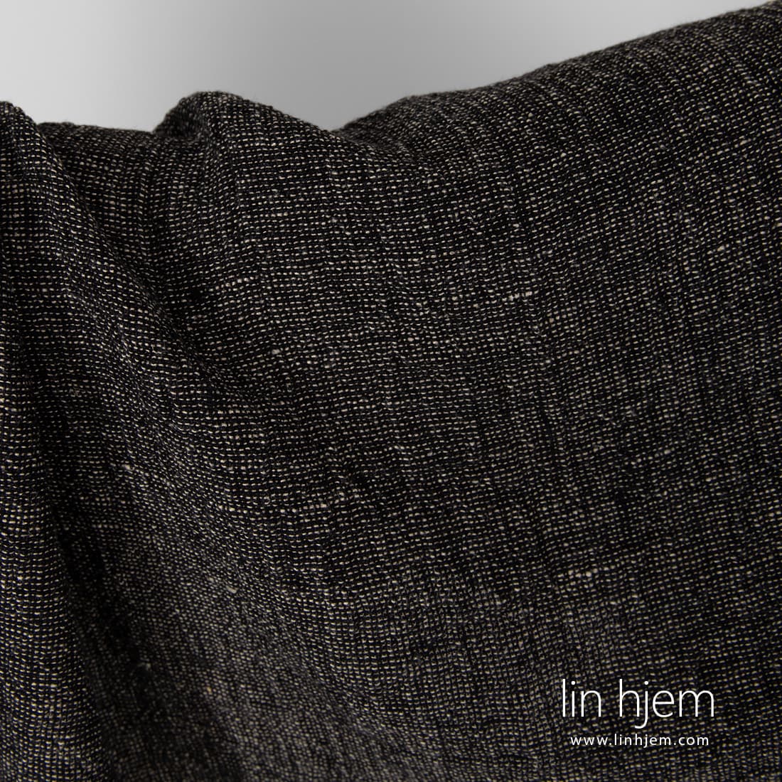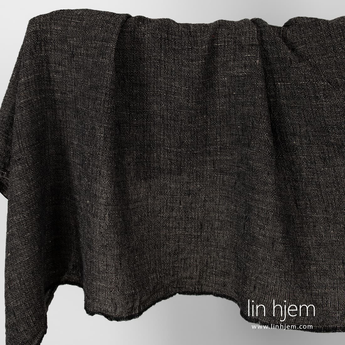 Vasket svart linstoff i brunaktig grå horisontale striper vevd av ufarget naturlig lingarn. Tykt, holdbart, tettvevd, tungt linstoff. Passer til å sy klær, hjem tekstil produkter.