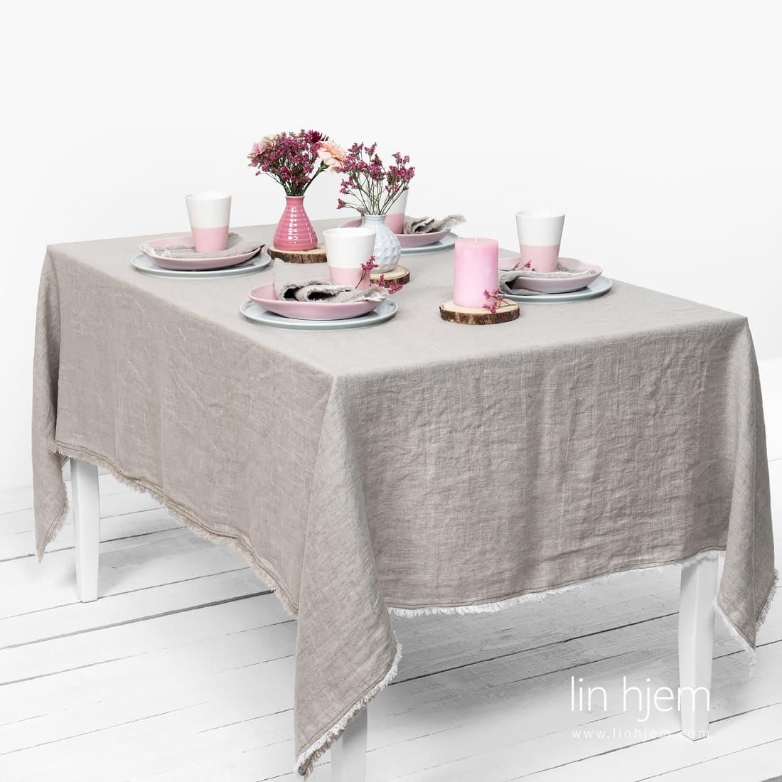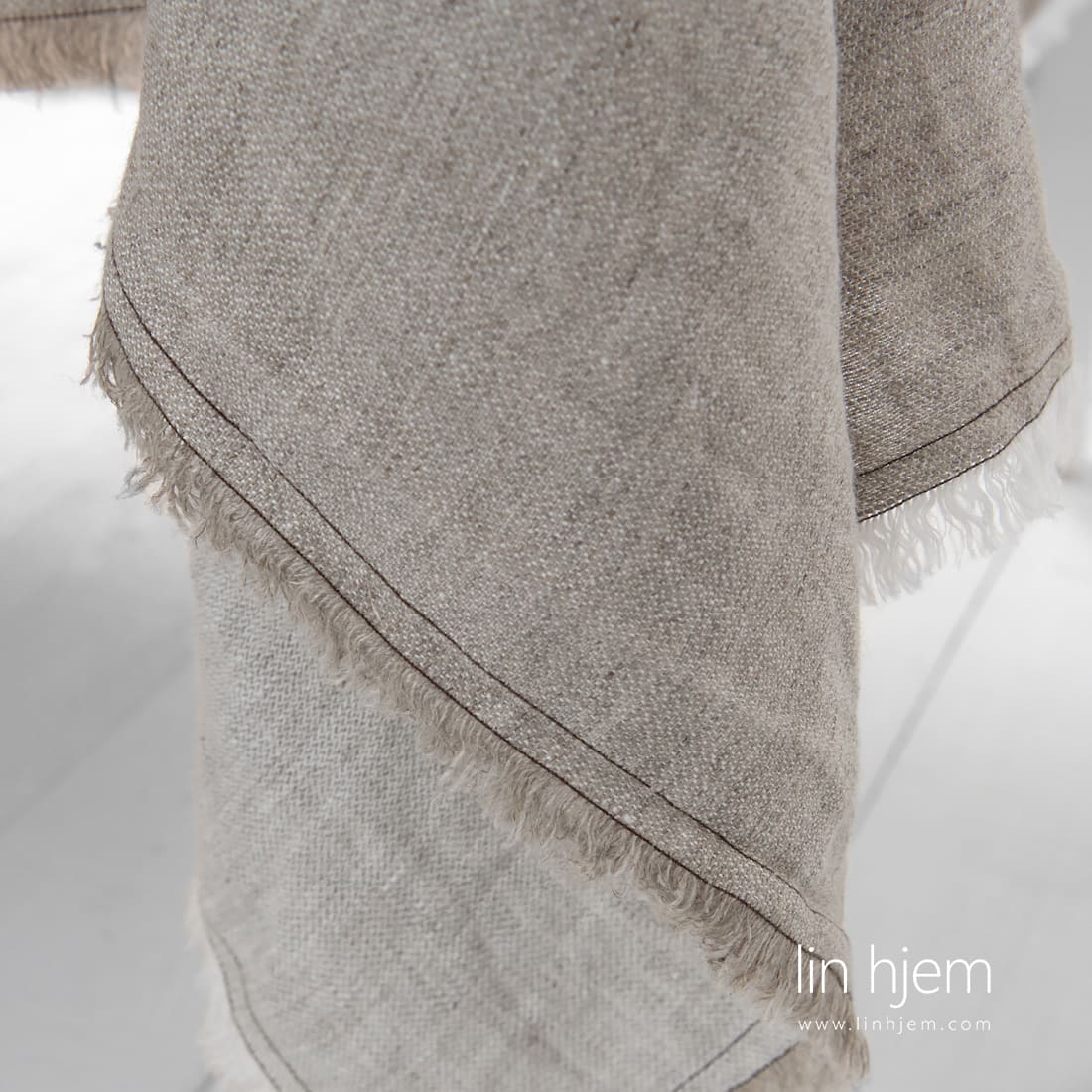 Lysegrå duk med frynser, vasket. Dette jacquard stoffet ble vevd av hvite og naturlig (ufarget) lingarn. Spesielt vasket stoff som er mykt og skånsomt. På den ene siden dominerer naturlig grå lin farge, på den andre lysere, gulaktig hvit farge. Dekorert med grå og hvite frynser og dobbeltsøm rundt av brune tråder.