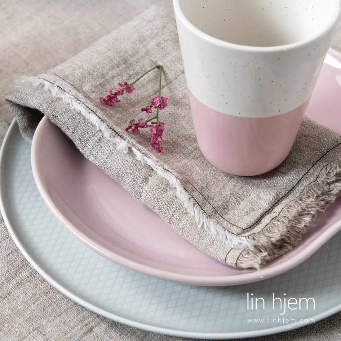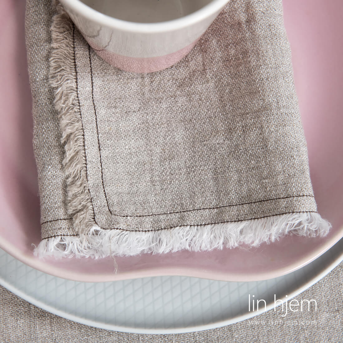 Lysegrå vasket linserviett med frynser og har to linjer med brune sting rundt. Servietter er veldig myke og skånsomme laget av spesielt vasket stoff. Du kan kombinere og matche serviettene med hvite og lysegrå duker.