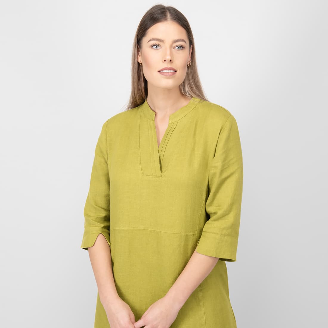 - Detaljer: V-utringning med plisseringer, 3/4-ermer med slisser, lommer