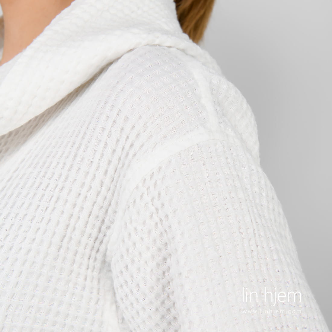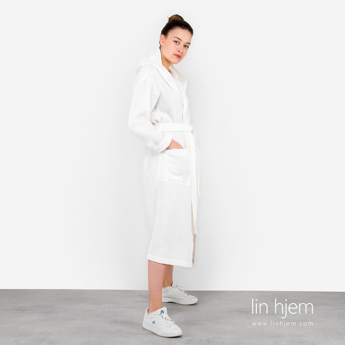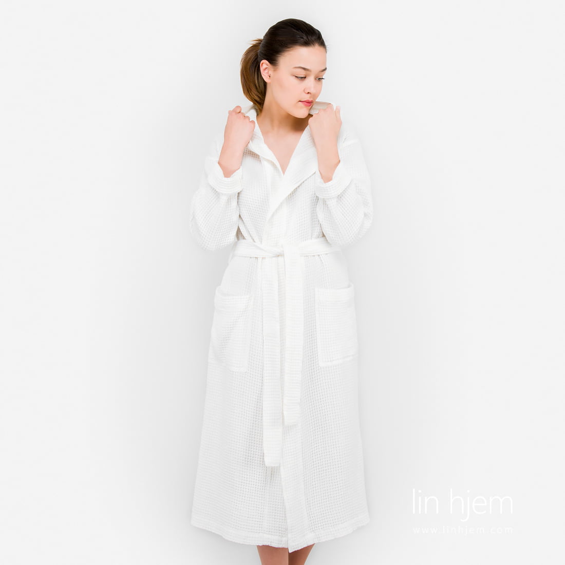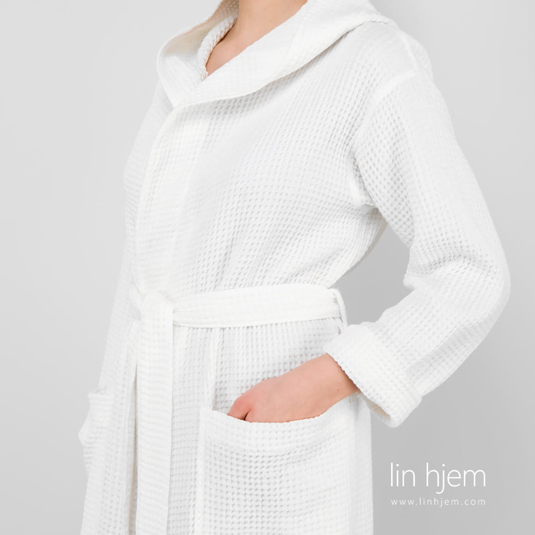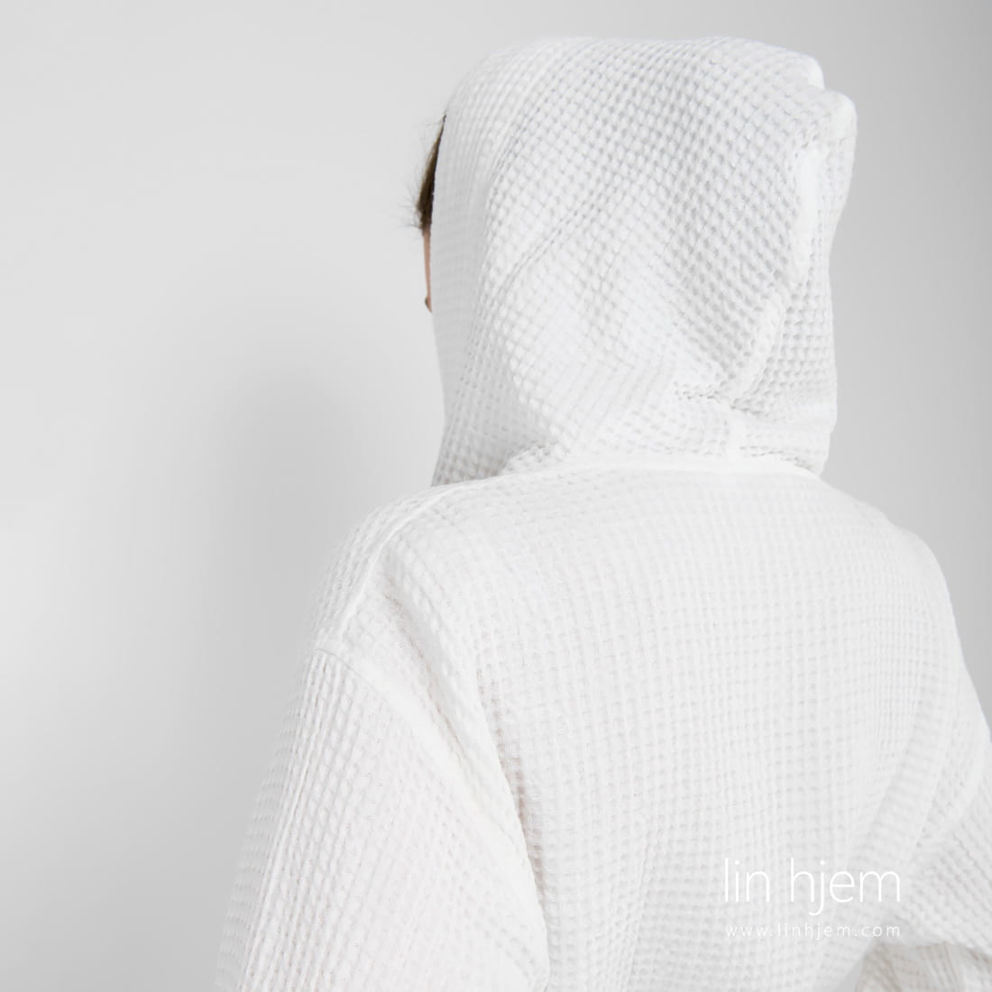 Hvit morgenkåpe dame med hette og 2 lommer foran. Unikt lin/bomull stoff ble spesielt vasket for å gjøre denne morgenkåpen ekstrem myk, skånsom og behagelig mot huden. Absorberer fuktighet godt og tørker fort. Varm og koselig morgenkåpe som kan også være en nydelig gave.