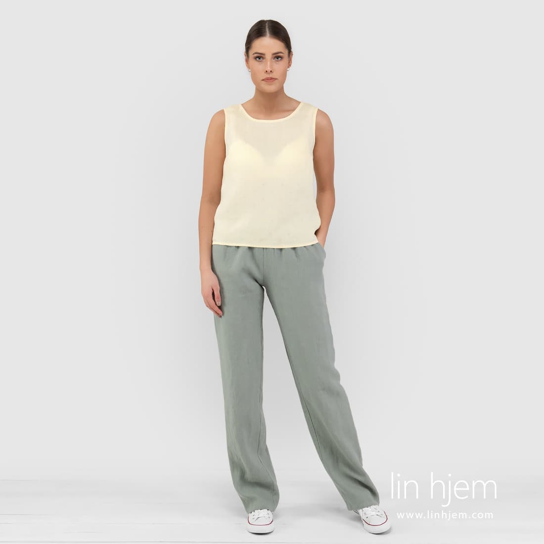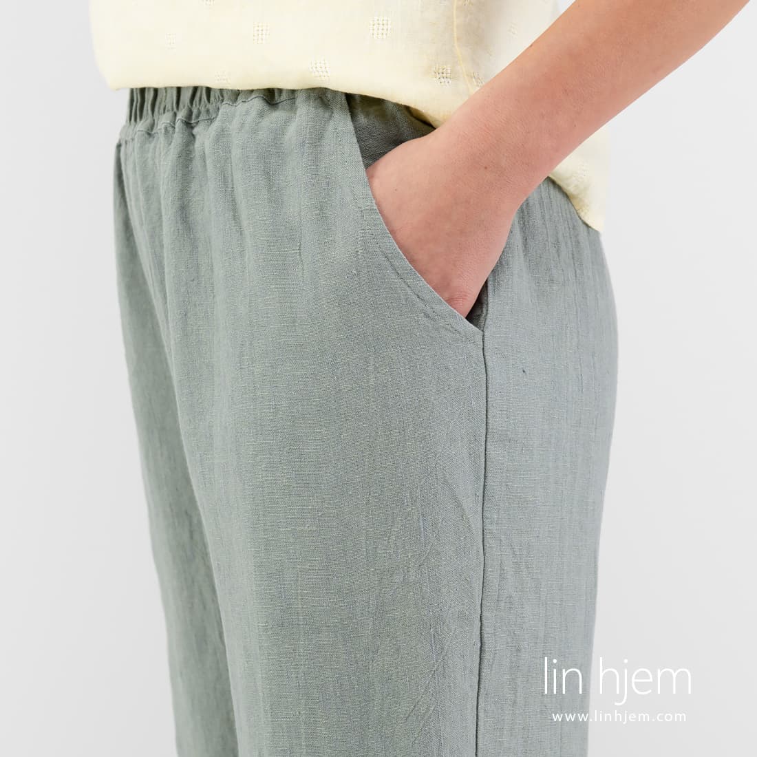 VERONA grønnaktig grå bukse. Produktets stoff er melange som ble vevd av blåaktig grå og lysegrønne lingarn. Denne modellen er sydd fra størrelse 36 til 54. Du finner den størrelsen som passer best! Veldig komfortabel og universell bukse som kan kombineres med lysere bluser, t-skjorter.