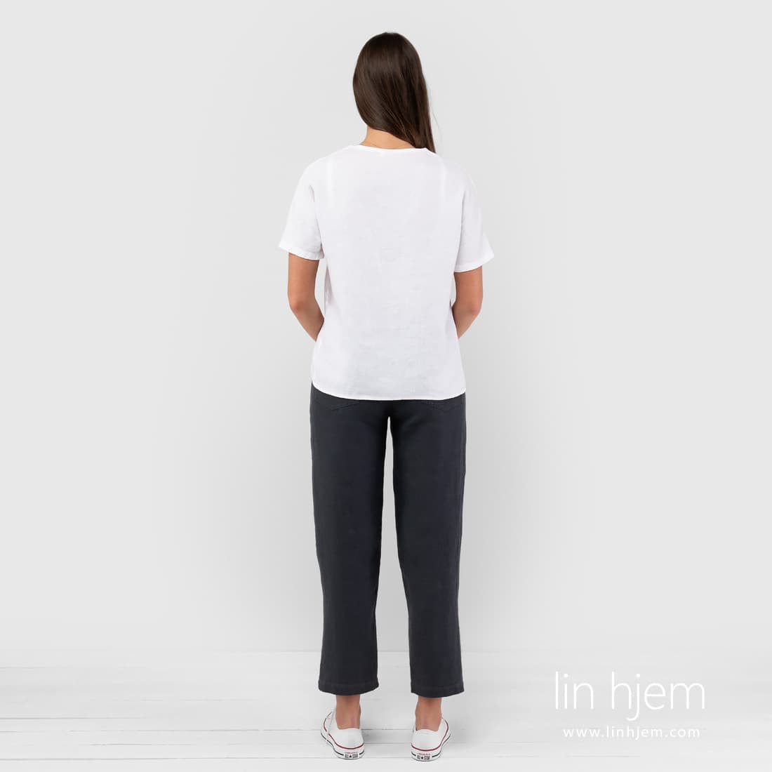 VIETNAM bluse laget av kritthvitt 100% linstoff. Denne blusen vil sikkert fange blikket til alle rundt deg med sin interessante asymmetriske bunnen. Hvit linbluse for de som elsker eksklusive klær!
