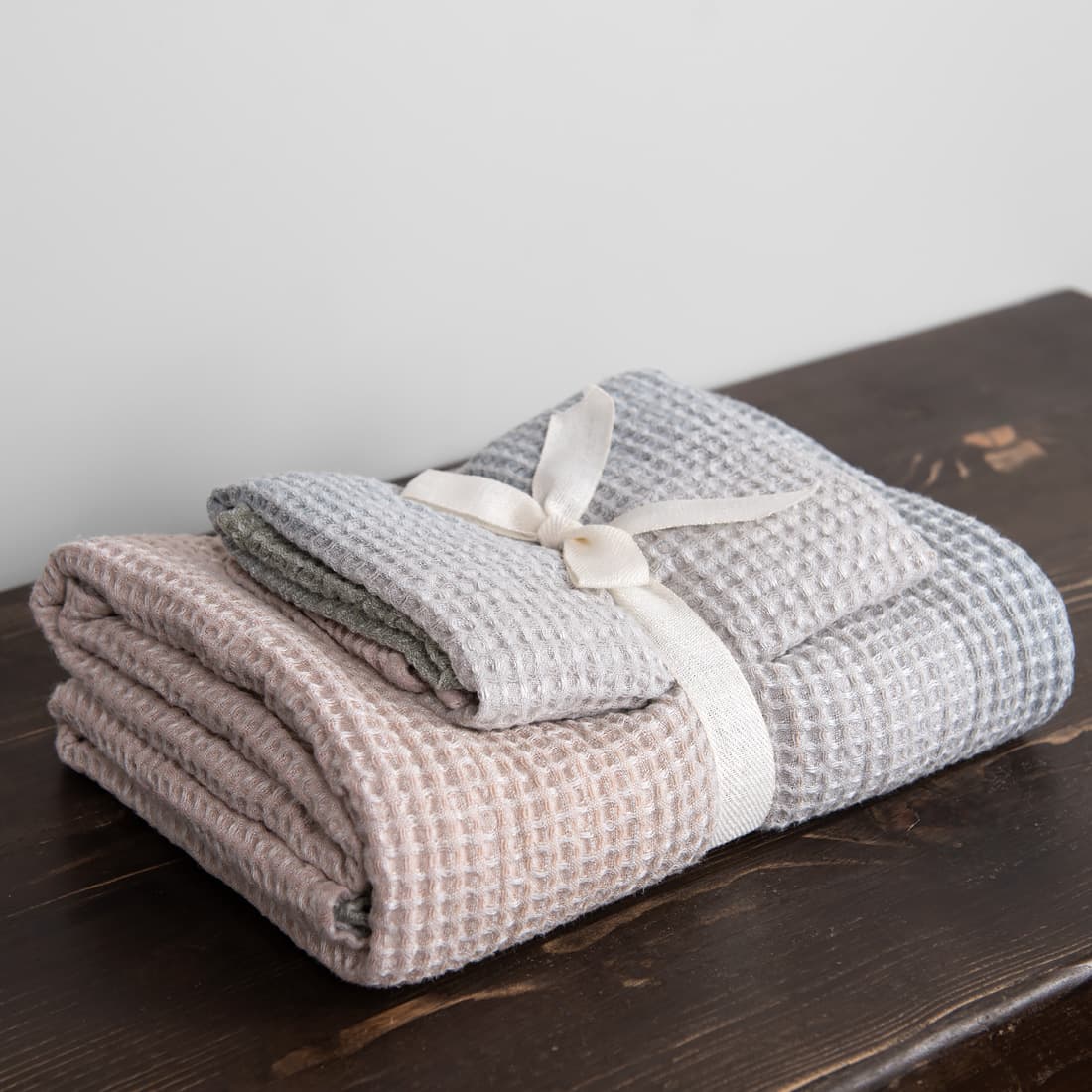 - Detaljer: løkke. Håndkle-sett bundet med et bredt bånd