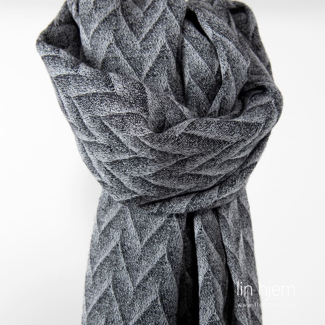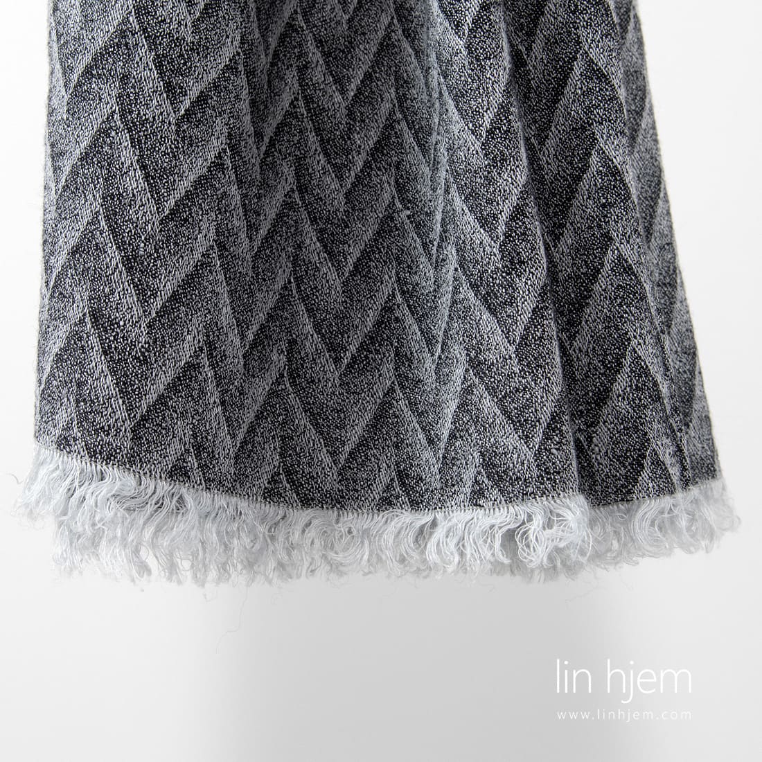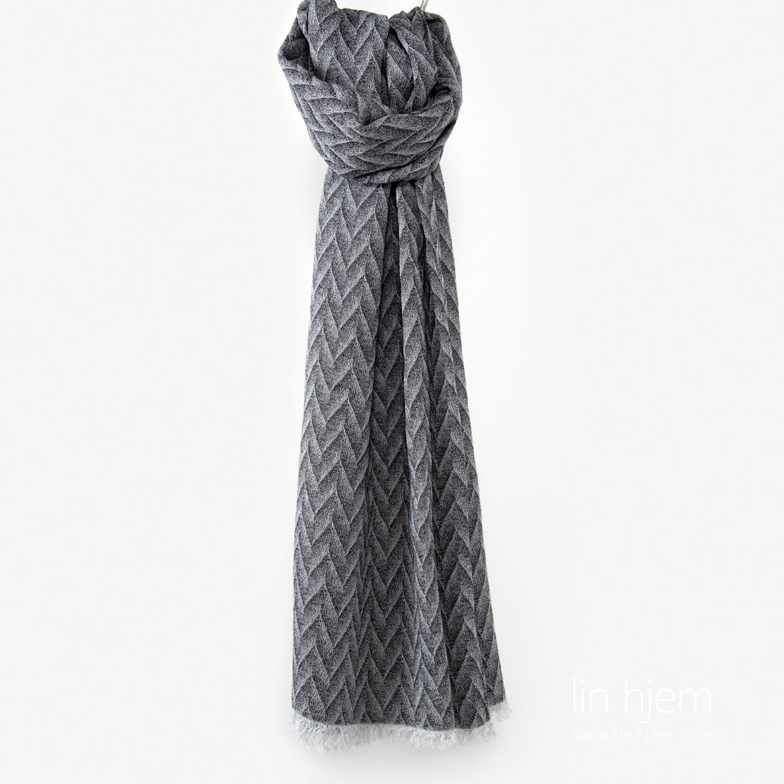 Svart sjal i lin-ull, mønstret. Sikk-sakk mønster ble vevd fra svarte og blåaktig grå lin og ull garn. Kortsidene dekorert med 2cm lange frynser. Stoffet ble spesielt vasket med ny teknologi for å gjøre sjalet skånsomt og mykt. Varmt sjal om vinteren er alt du trenger!